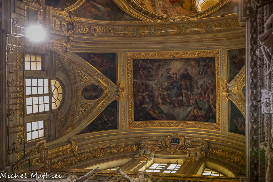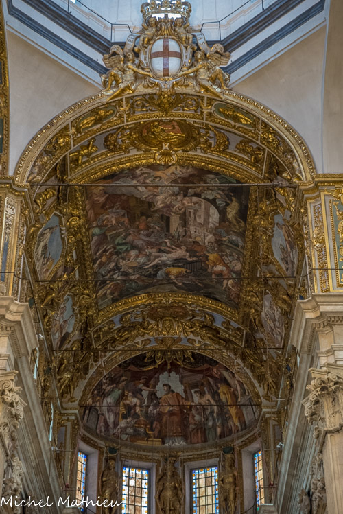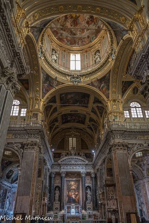 Chiesa del Gesù. La nef centrale et la coupole sont ornées de fresques de Giovanni Bernardo Carlone (1624), ce dernier étant l’auteur de la fresque des Quatre Évangélistes se trouvant au pied de la coupole. Les quatre grandes statues sont des œuvres du sculpteur Francesco Biggi.