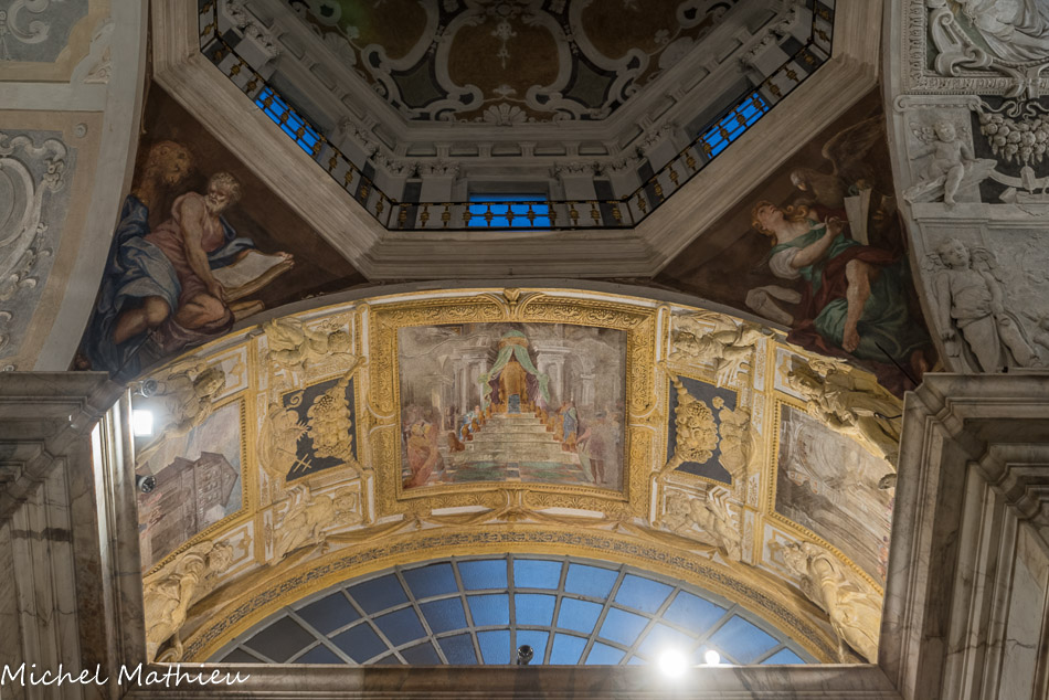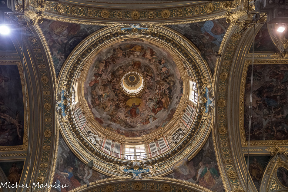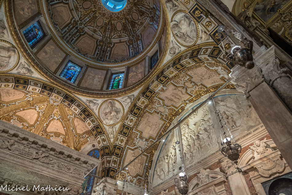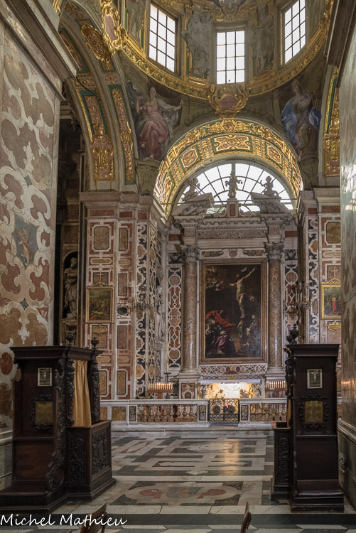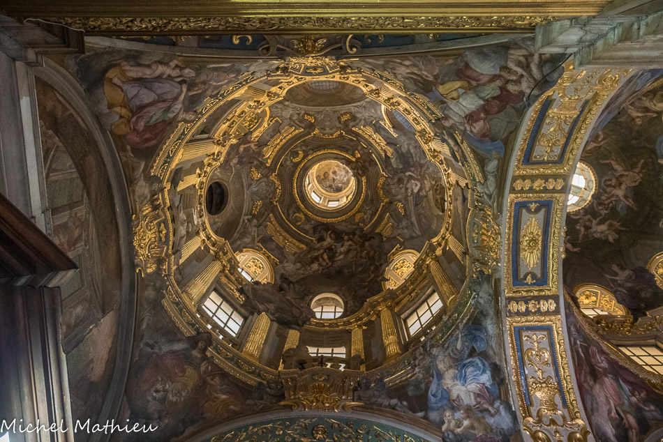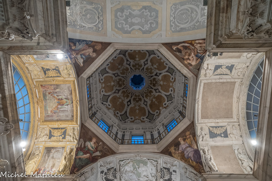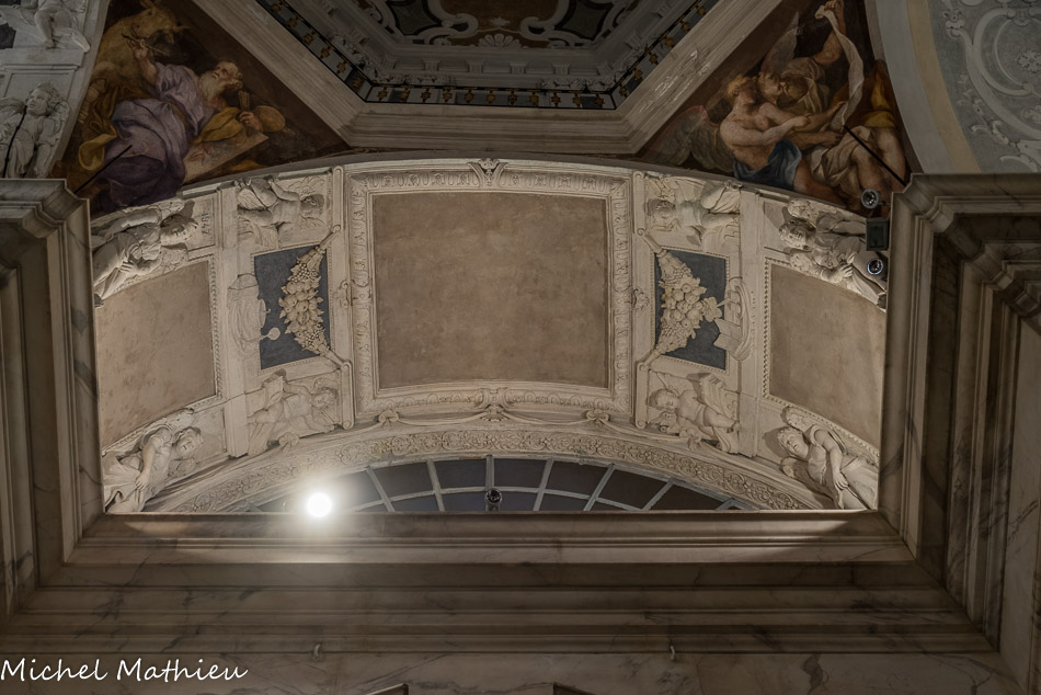 Place Banchi. Harmonieux est l’intérieur de la coupole de base octogonale et dont les pendentifs présentent les quatre évangélistes avec leur attribut respectif. En bas, Saint Jean et son aigle, et Saint Luc et son taureau. En haut, Saint Marc et son lion, et Saint Matthieu et son homme.