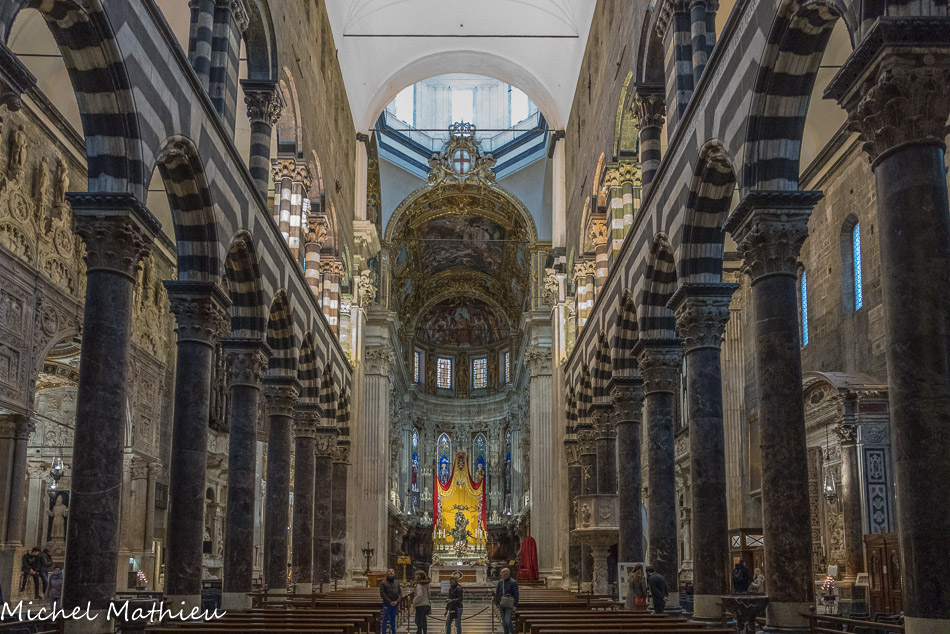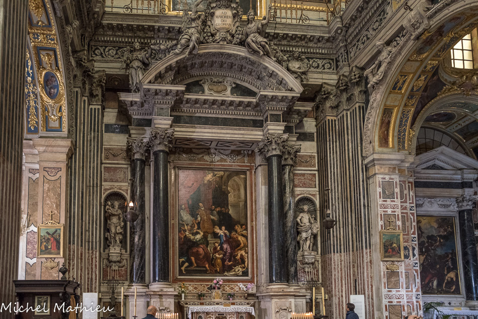 Chiesa del Gesù. La création de la basilique, ses formes actuelles et son nom de Chiesa del Gesù sont liés à la grande reconstruction du XVIe siècle voulue par la Compagnie de Jésus, sur un projet de Giuseppe Valeriano, peintre, architecte et père jésuite. L’église est consacrée aux Saints Ambroise et André, car l’originale, datant du VIe siècle, était consacrée à Ambroise, évêque de Milan, qui s’était réfugié à Gênes pour fuir le pillage lombard du roi Alboïn.