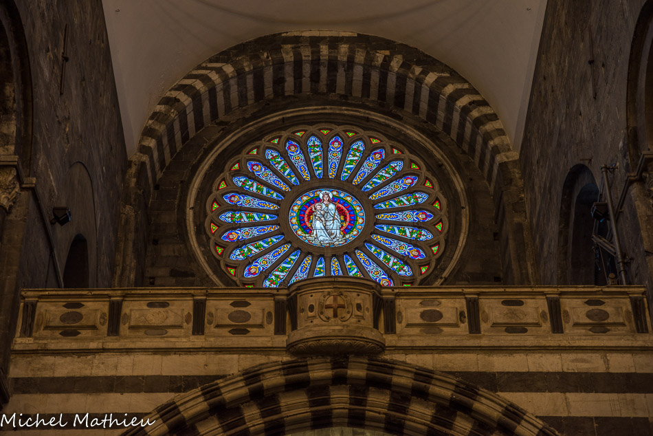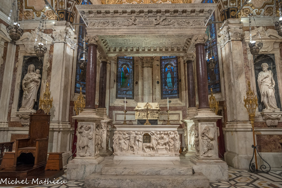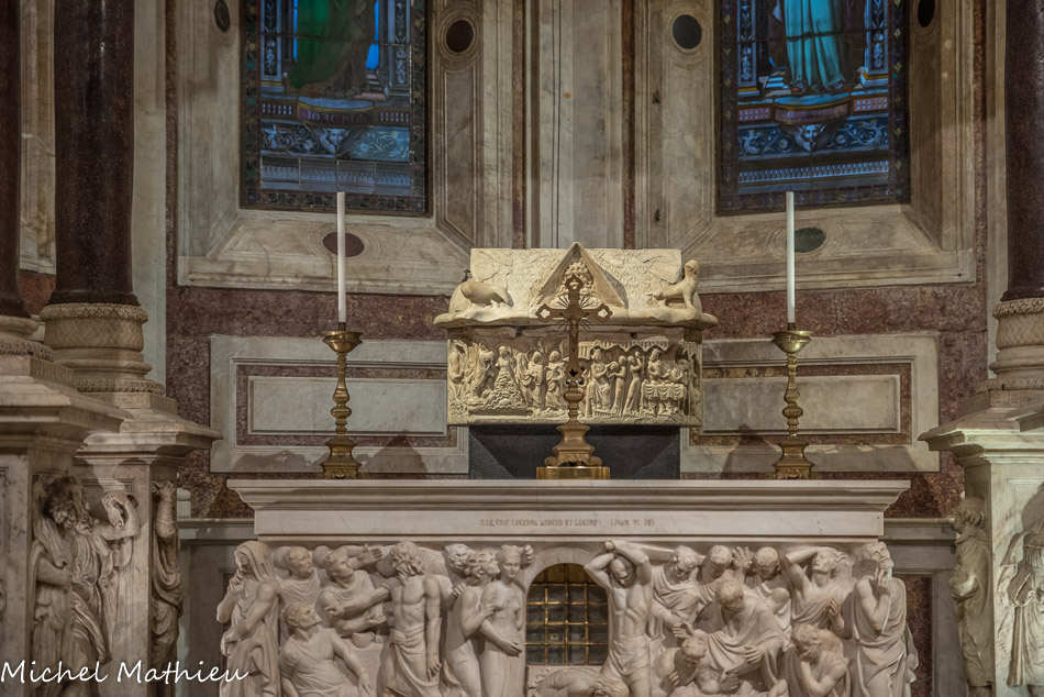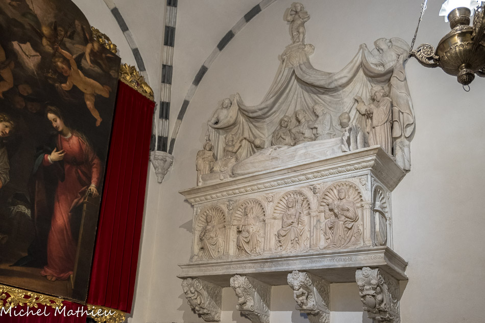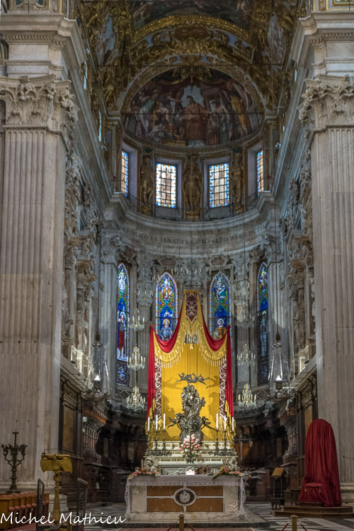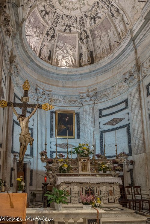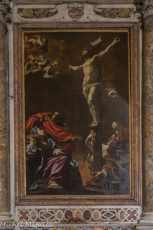 Place Banchi. Précieux sont les marbres de la table de l’autel principal près du crucifix du dix-septième siècle aux harmonieuses formes esthétiques et son intense expressivité.
