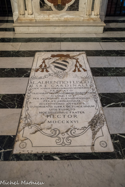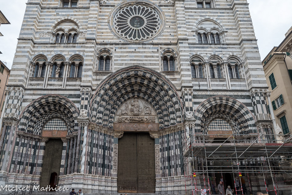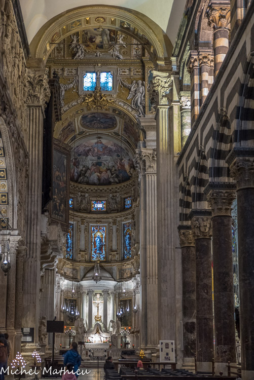 Chiesa del Gesù. La façade est refaite durant la seconde moitié du XIXe siècle, après la démolition de l’arcade qui mettait en communication directe le palais ducal avec l'église du Gesù, par sa façade, prenant pour modèle d’anciens projets de Pierre-Paul Rubens. Terminée en 1894, elle est enjolivée des statues de saint Ambroise (à droite) et de saint André (à gauche, avec sa croix), œuvres de Michele Ramognino
