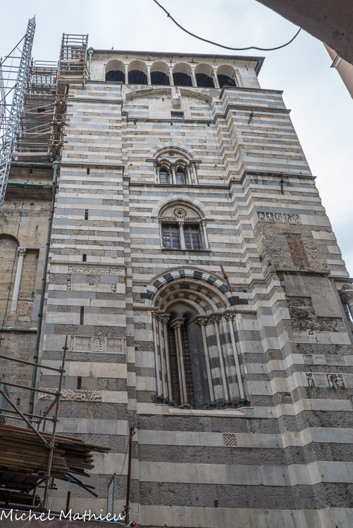 Palais Saint Georges..Construit en 1260 par l'architecte cistercien Oliverio sur ordre de Guglielmo Boccanegra, oncle de Simone Boccanegra, le premier doge de Gênes, les matériaux de sa construction proviennent de la démolition de l'ambassade vénitienne de Constantinople, obtenus de l'empereur byzantin Michel VIII pour l'aide génoise contre l'empire latin. Le palais, prévu pour la création d'un centre civil et politique (palazzo del Capitano del Popolo), était destiné à élever la puissance temporelle du gouvernement de la république de Gênes en face de la puissance religieuse du clergé portée au Duomo di San Lorenzo.