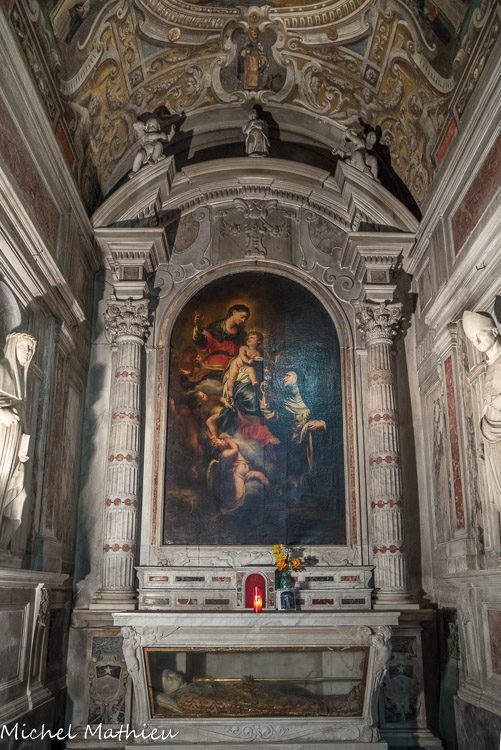 Église Santa Maria di Castello. Chapelle de sainte Rose de Lima. A gauche, statue de Sainte Catherine de Sienne et à droite, celle du Bienheureux Giacamo de Varazze, de Taddeo Carlone et Battista Baguti. La toile représente La Vierge qui présente l'Enfant à Sainte Rose de Lima, 1673, Domenico Piola.