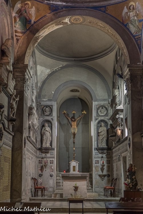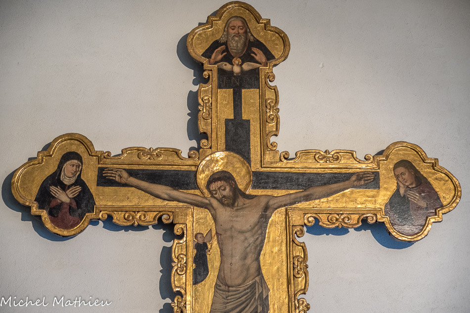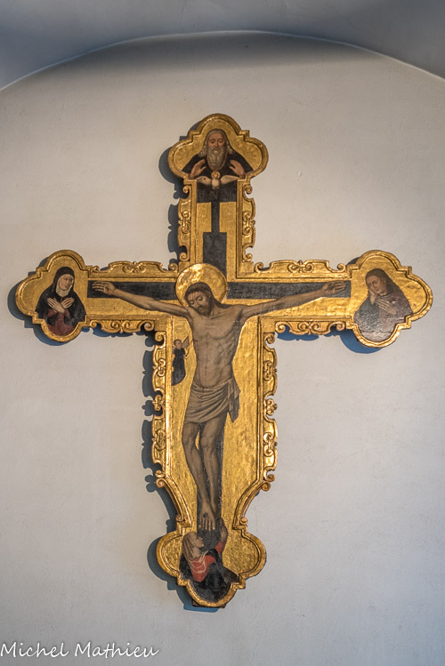 Église Santa Maria di Castello. Antoine Bréa, crucufix. Les Christe médiévaux sont représentés morts sur la croix. Les bourgeons au bout des bras représentent la vie éternelle. A gauche, un chérubin qui recueille le sang du Christ.