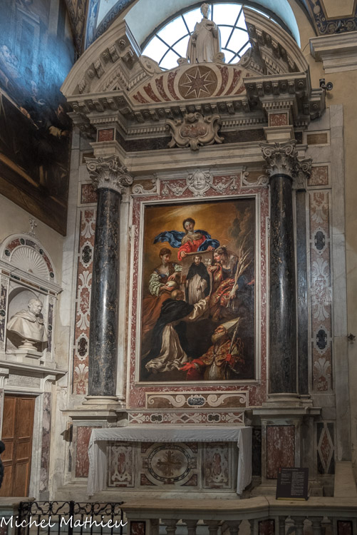 Église Santa Maria di Castello. Chapelle de Saint Dominique. Refaite en 1654, l'autel est en marbre polychrome, avec des colonnes en pophyre et des corniches en rouge de France. La toile est placée dans un autel en marbre polychrome de la première moitié du XVIIe siècle. Il représente le miracle de Soriano : dans cette ville calabraise, la Vierge Marie et les saints Marie-Madeleine et Catherine d'Alexandrie seraient apparus en 1530 à un membre du clergé dominicain livrant une image de saint Dominique à placer dans le couvent nouvellement construit. Gio Battista Castigliano, dit il Grechetto, 1654. En haut, statue de Saint Dominique, de Taddeo Carlone et Battista Baguti.