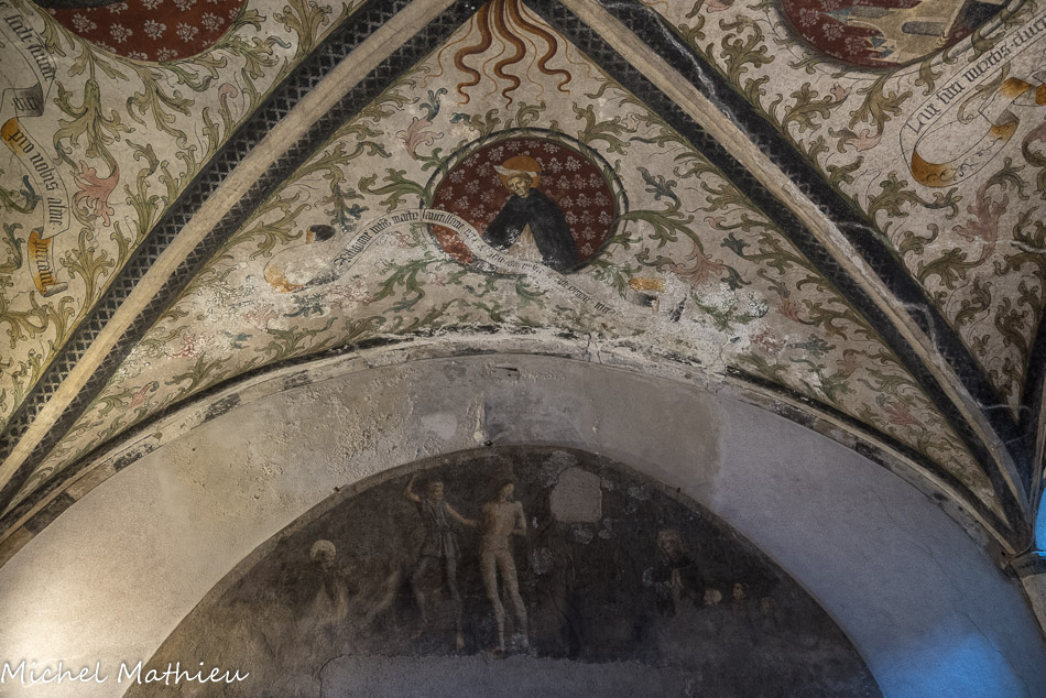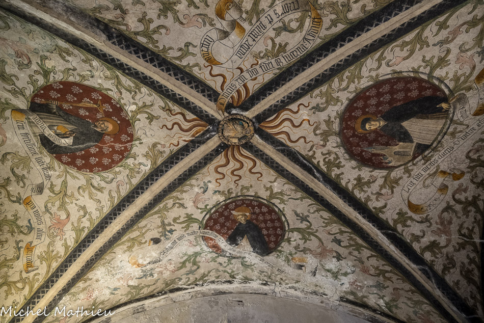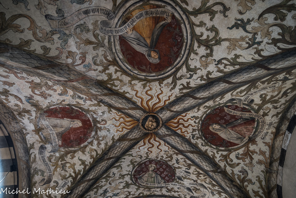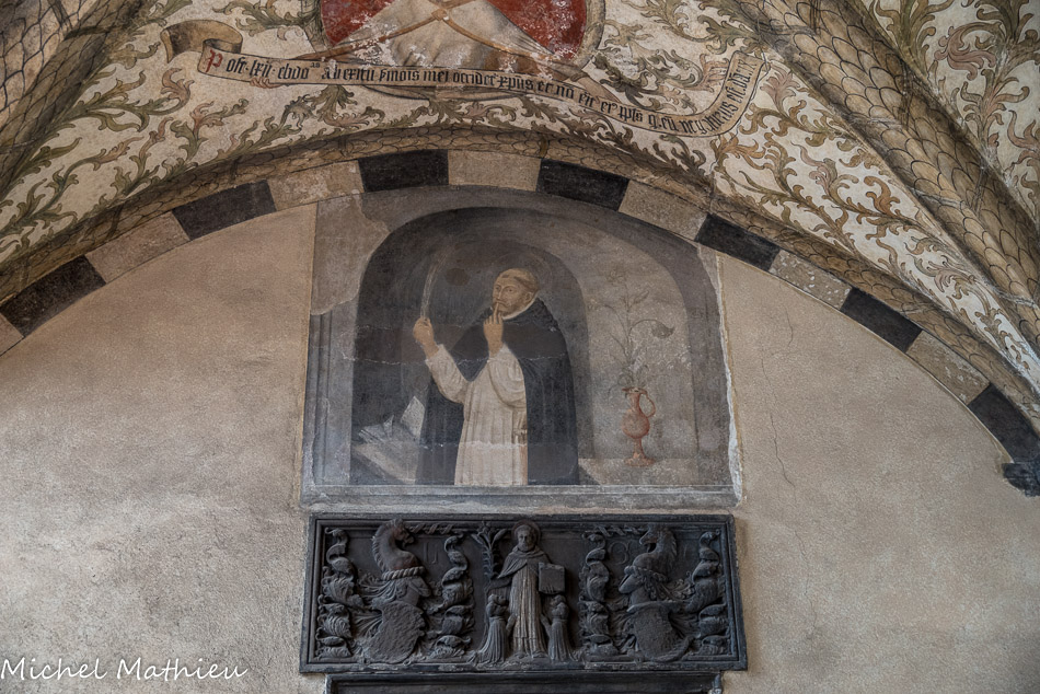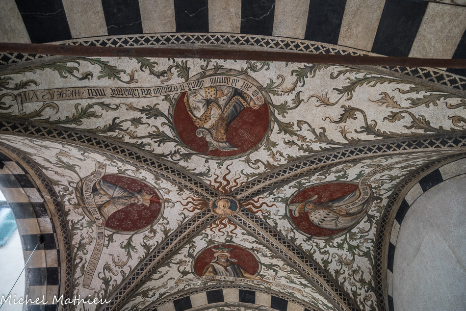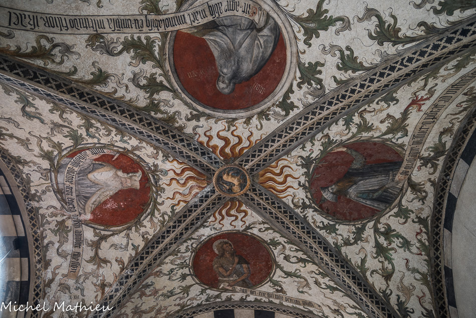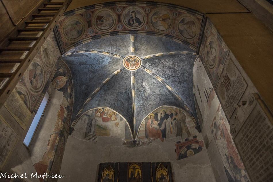 Église Santa Maria di Castello. Clé de voûte : Saint Dominique. Dans les quartiers : Saint Thomas d'Aquin (qui porte l'Eglise) ; Saint Vincent Ferrer (avec le crucufix à la main) ; Saint Pierre Martyr (avec la tête transpercée). Fresques fin XV, Maitre de l'Annonciation del Monte.