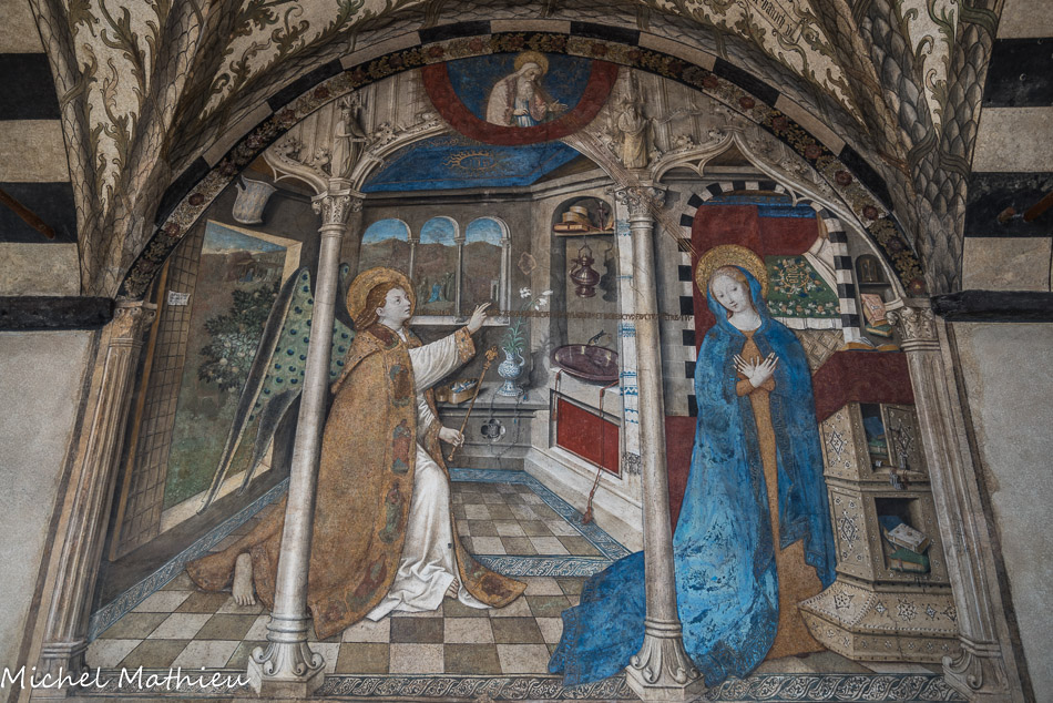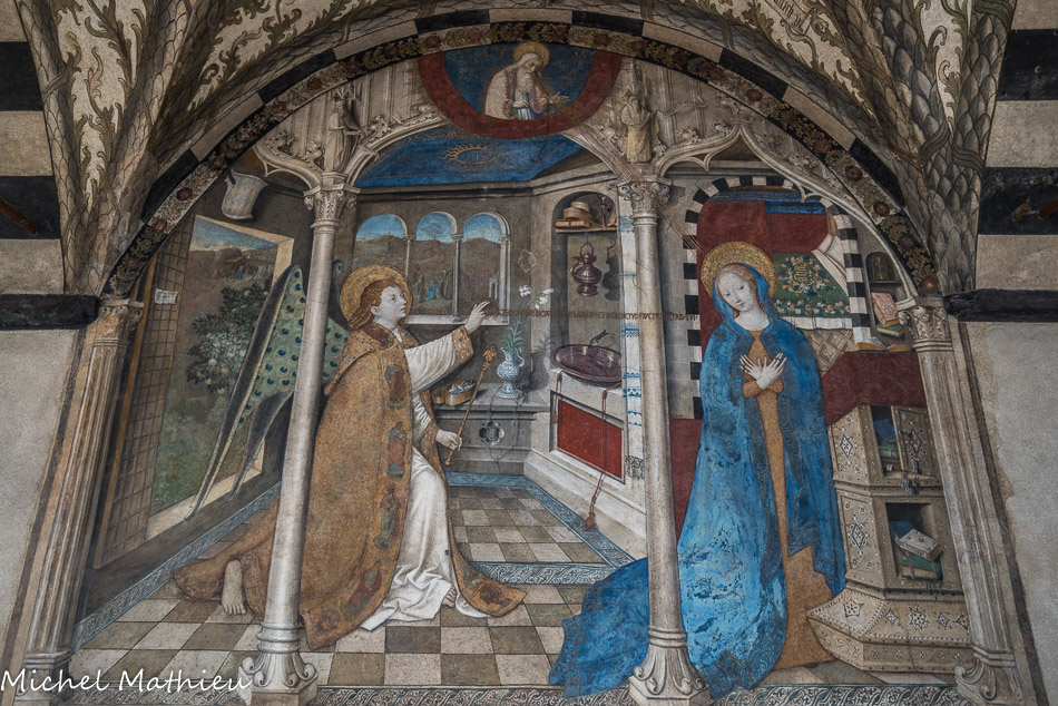 Église Santa Maria di Castello. Annonciation de Giusto d'Alemagna. La peinture (ce n’est pas une fresque) est la seule œuvre signée et datée (1451) de l'artiste; en témoigne l’inscription située sur le chambranle de la porte de gauche.