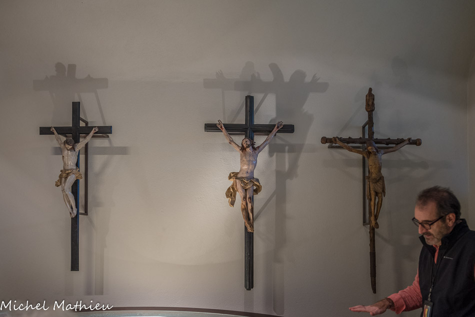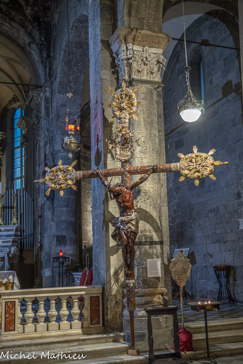 Église Santa Maria di Castello. Antoine Bréa, crucufix. Les Christe médiévaux sont représentés morts sur la croix. Les bourgeons au bout des bras représentent la vie éternelle.