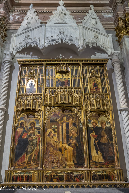 Église Santa Maria di Castello. Polyptyque de l'Annonciation. Sous le baldaquin en marbre du XVe siècle de l'atelier de Dominico Gagini, le polyptique frappe par sa menuiserie en bois doré d'origine, également l'œuvre de Mazone. Il se compose de la table centrale et de deux compartiments, avec, à gauche, les saints Jacques et Jean-Baptiste, et à droite, les saints Dominique et Sébastien ; dans le registre supérieur sont représentés le calvaire entre les saints Jean l’évangéliste et Rocco, tandis que dans la prédelle on a des épisodes de l’enfance de Jésus. Dans le somptueux costume de l’archange Gabriel et dans le carrelage d’ Azulejos, on a la suggestion du luxe mystique des Catalans . La couleur vive sans transitions tonales semble être affectée par les compositions espagnoles et portugaises, mais l'utilisation judicieuse de la perspective est totalement italienne.