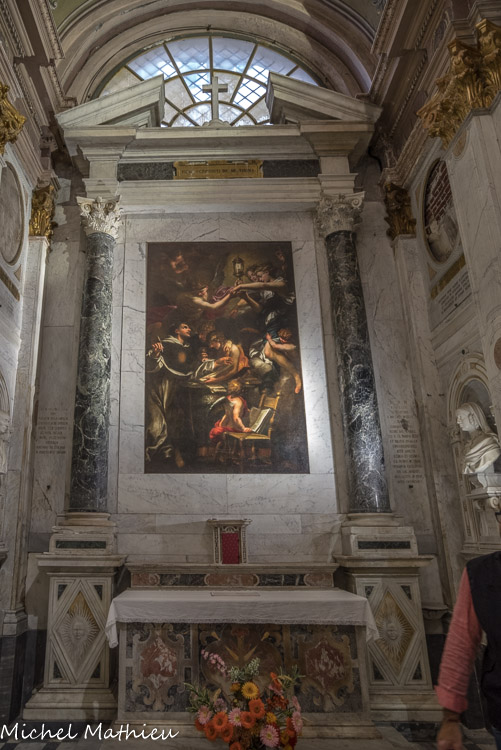 Église Santa Maria di Castello. Chapelle de Saint Thomas d'Aquin. Autel en marbre de Giovanni Maria de Pambio, 1595. Toile de l'autel de Dominico Piola, Saint Thomas d'Aquin en adoration du Saint Sacrement composant l'office du Corpus Domini, 1660. A gauche, le buste deFilippo Campo Antico (1874) et à droite celui d'Anna Pavero Campo Antico, tous deux de Domenico Carli. Ce sont les parents du curé qui a financé la restauration de cette chapelle.