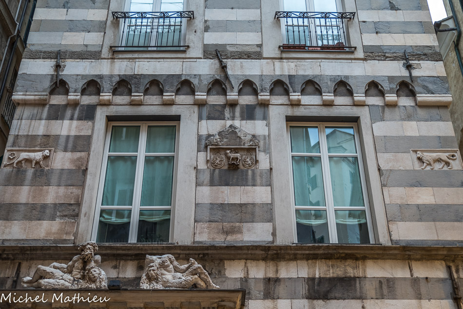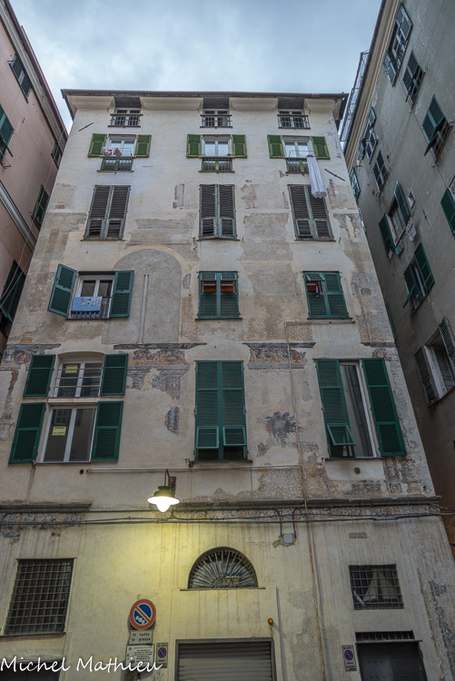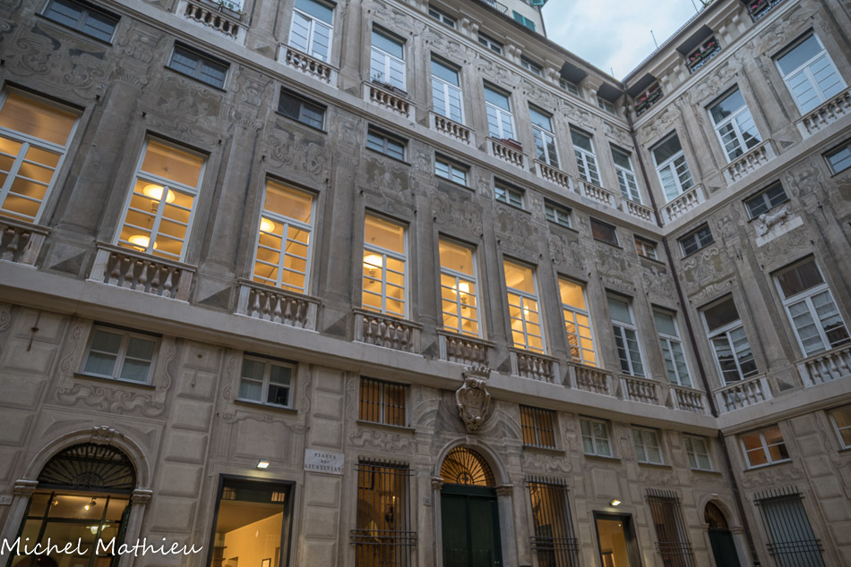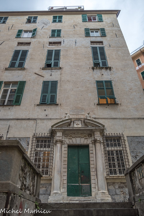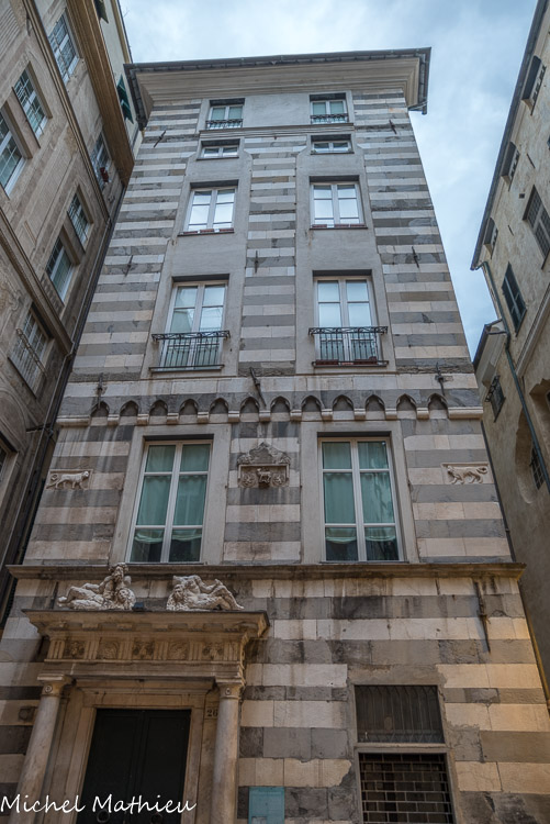 Palais Agostino et Giacomo Salvago. L'empreinte médiévale tardive est évidente avec les bandes bichromes et les petits arcs trilobés.