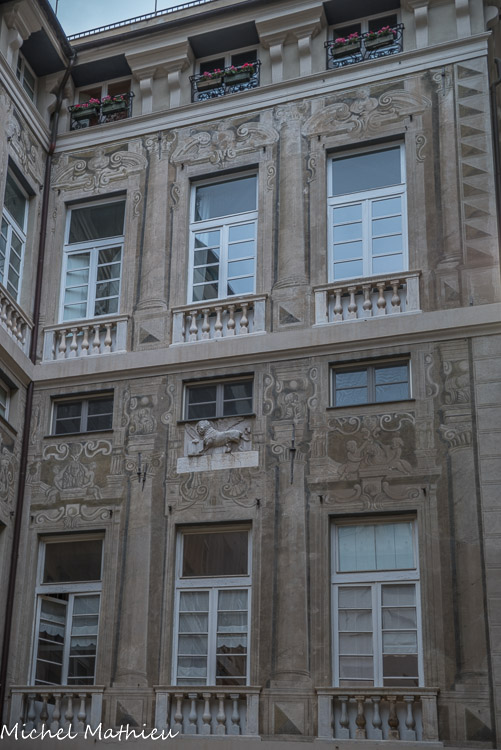 Palais Marcantonio Giustiniani. L’aspect unitaire du bâtiment est dû à une série d’interventions que la famille Giustiniani , en particulier de Marcantonio, réalise entre le XVIIe et le XVIIIe siècle avec l’achat et la fusion de l’aile nord de Filippo Scaglia. C'est sur la façade de ce dernier que l'on peut encore voir un bas-relief avec le lion de San Marco, rapporté de Pula en 1380 après la dernière défaite de la République de Venise , pendant la guerre de Chioggia. Sur la place, agrandie, surélevée de quelques marches au XVe siècle et fermée par des petits murs bas pour marquer les limites de la propriété de la famille, donnent deux étages nobles , signe de la présence de deux lignes de succession.
