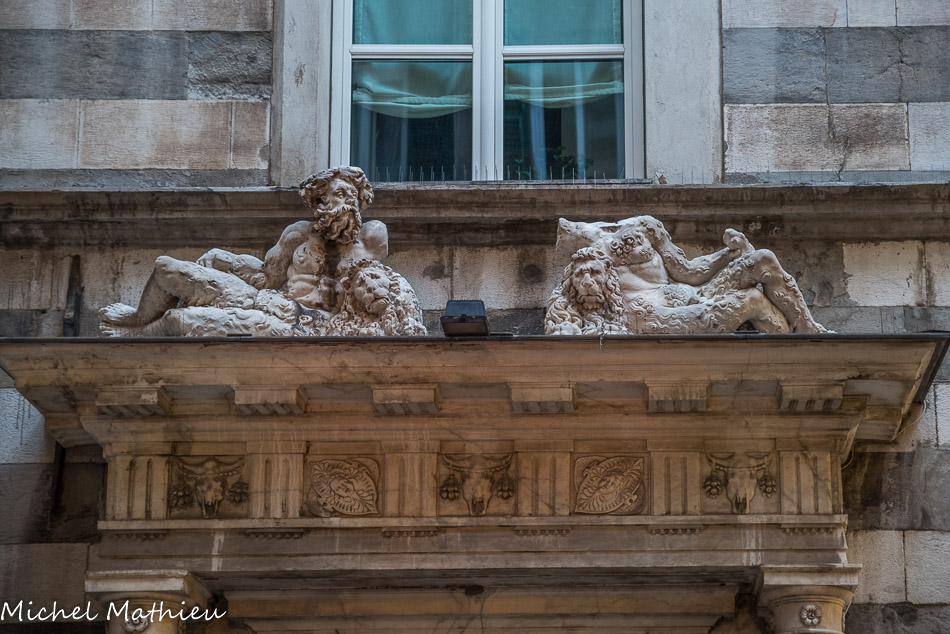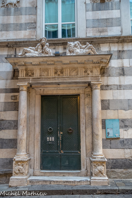 Palais Agostino e Giacomo Salvago. Ce qui reste aujourd'hui de l'extérieur est le portail de Giacomo Della Porta et Nicolò da Corte ; les deux statues de marbre du tympan représentent deux hommes sauvages s'appuyant sur des lions, symbole de la famille Salvago.