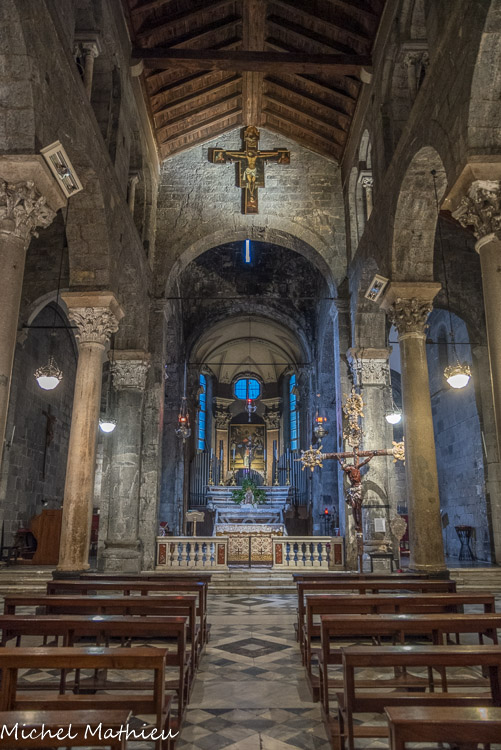 L'église San Donato. L'intérieur présente un plan basilical à trois nefs, chacune avec sa propre abside, séparées par douze colonnes dont la typologie indique les différentes phases de la construction : six romaines monolithiques en granit et six autres à bandes blanches et noires avec des chapiteaux romans.