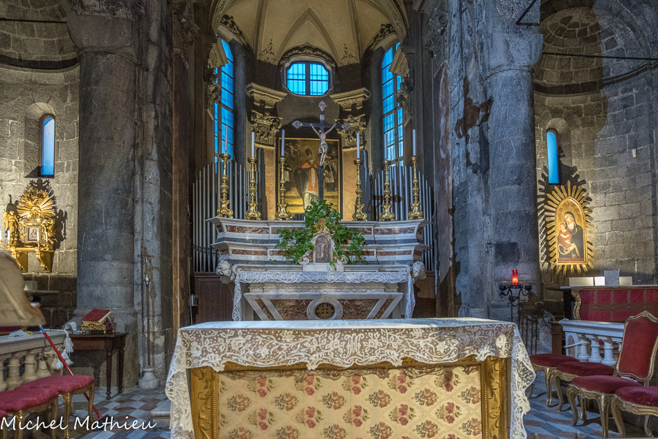 Église Santa Maria di Castello. Sous l'autel, le gisant de Giacomo de Varazze, dominicain, archevêque de Gênes (1292-1298), auteur de la Légende dorée.