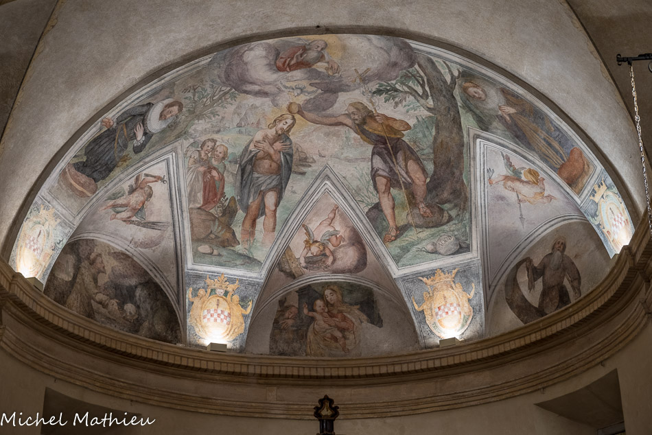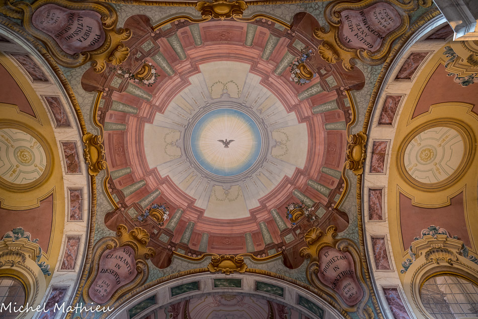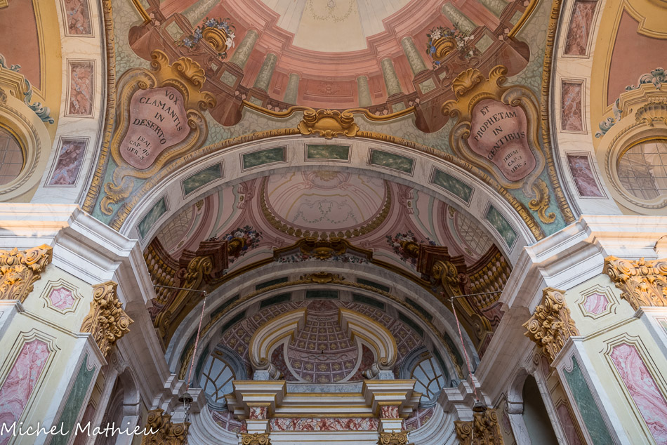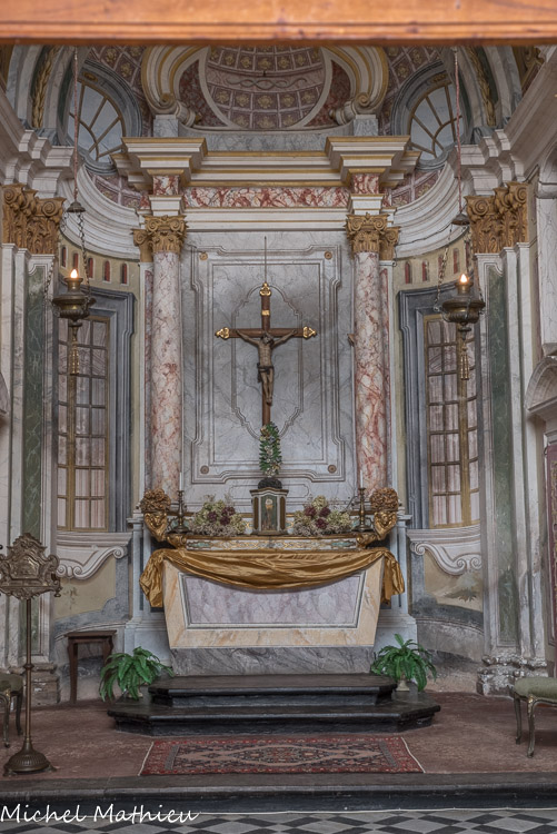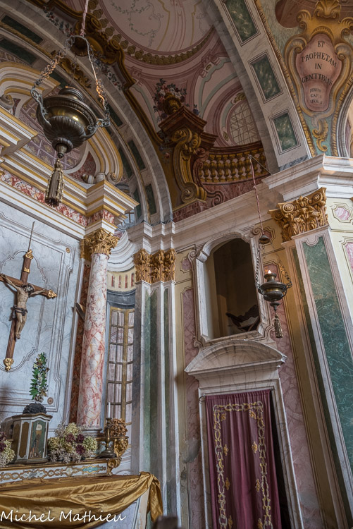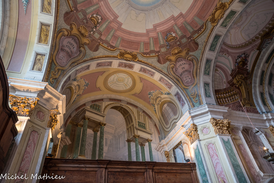 Château de Rocca Grimalda. La chapelle. L'effet de perspective des fenêtres, des fausses architectures, des balustrades et des coffres est très spectaculaire.