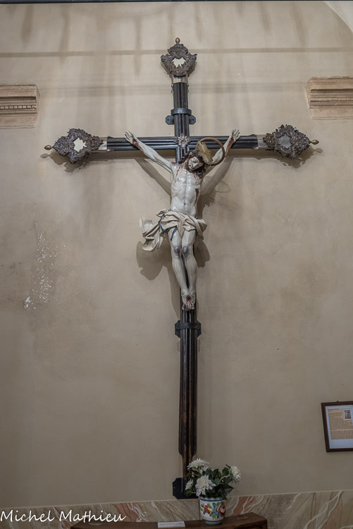 Lerma. Crucifix de procession de Maragliano. Le visage baissé du Christ, le corps contracté, la tête mollement inclinée sur l'épaule, le périzonium (pagne) tourmenté et déchiré, les genoux blessés et sanguinolents à la suite de la chute lors de la montée au Calvaire, manifestent l'intensité du drame qui précède le moment de la mort du Christ. Les extrémités de la croix sont richement travaillées, sans doute par des argentiers génois. Le contraste entre le corps livide et le bois sombre de la croix contribue à la force de l'impact du sujet représenté.