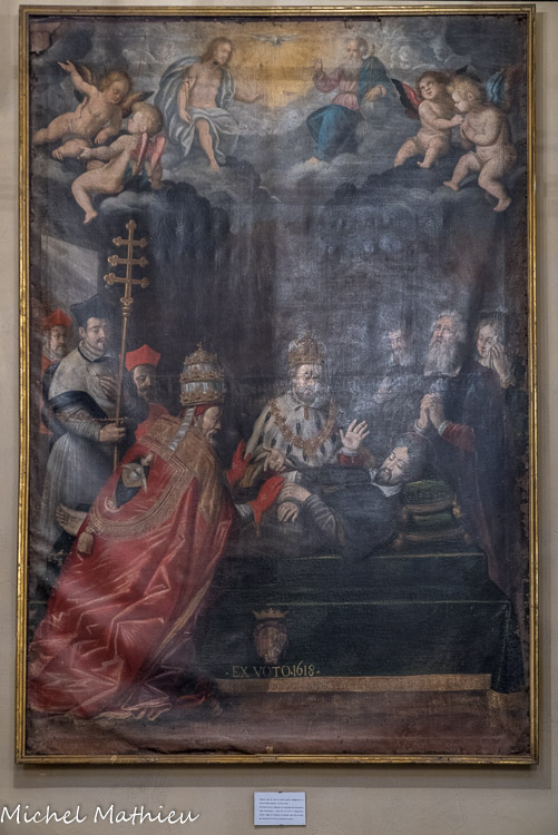 Lerma. Lerma. Huile sur toile, d'un auteur inconnu, représentant la mort de San Alessio, ex voto de 1618. On y voit au chevet du moribond, le Pape Innocent I (401-417) et l'empereur Onorio, fils de Théodose le Grand (395-423) pour en admirer la vie et en honorer la mort.