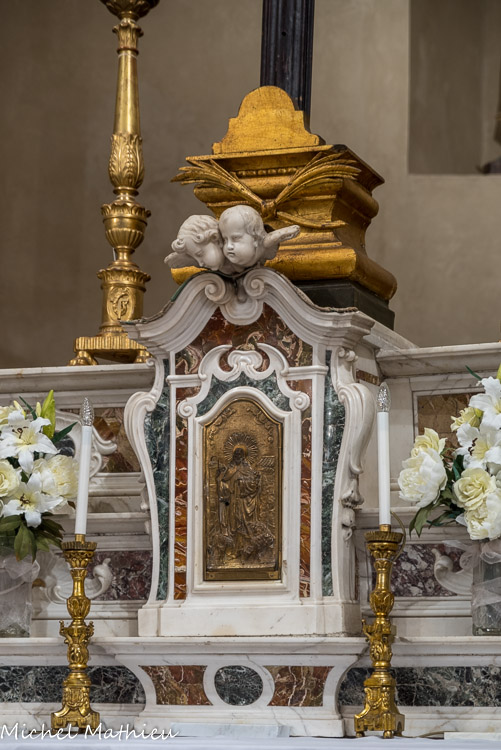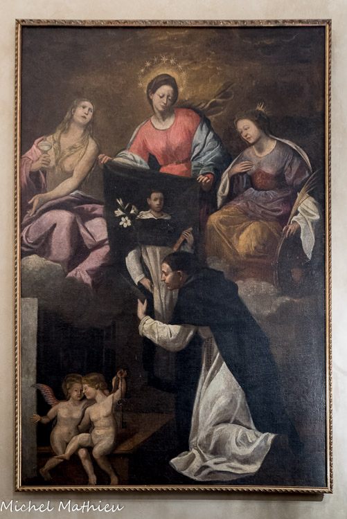 Lerma. La toile représente la Vierge avec, à ses côtés, Saintes Catherine et Marie-Madeleine, et qui présente à un dominicain le tableau, miraculeusement apparu à Soriano Calabro, du portrait de saint Dominique Guzman ( fondateur en 1215 de l'ordre des Frères prédicateurs) qui tient entre ses bras le livre de ses premières constitutions. Date et auteur inconnus.