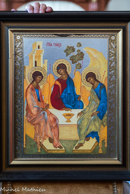 L'icône de la Trinité est une icône russe peinte par Andreï Roublev entre 1410 et 14271, dont le sujet est l'hospitalité d’Abraham. Elle se situe dans une période historique de guerre contre les Mongols, qui ne prendra fin qu'en 1480 sous Ivan III. Elle représente trois anges pèlerins tenant un long sceptre (mêrilo) entre leurs doigts, assis en croix autour d'une table, sur laquelle est posée une coupe. Leur tête est auréolée d'une nimbe d'or. Les trois anges se ressemblent car ils symbolisent la Trinité, la triple incarnation du Dieu unique. La forme de leurs yeux en amande leur donne une expression mystérieuse. Le paysage participe à ce mystère : le tronc noueux du chêne, le rocher en surplomb qui s'incline au même rythme que les anges. Pour exprimer l'unité existant entre les trois anges Roublev compose son icône dans un cercle dont la circonférence passe par le milieu de chacune des nimbes et dont le centre est la main gauche du personnage central. Les avis divergent sur l'attribution des figures angéliques aux personnes de la Trinité et dans l'interprétation du visage que l'on devine dans la coupe. Le Personnage central est reconnu par certains par les particularités de son habillement. C'est un Christ pantocrator à la robe rouge (la terre), opaque, au manteau bleu (le ciel). D'autres critiques voient dans ce personnage central le Père. Derrière lui, dans cette dernière interprétation, se trouve l'arbre de vie, l'arbre de la création. Le Personnage situé à droite est également reconnu par certains comme le Christ. Le rocher est celui du songe de Nabuchodonosor ou la grotte de Bethléem ou celui du tombeau du Christ. L'interprétation des couleurs de ses vêtements, le bleu qui symbolise la sagesse et le vert la nature permet encore de voir dans ce personnage la Sagesse incarnée, c'est-à-dire le Verbe, deuxième personne de la Trinité. Selon la théologie chrétienne, ce Verbe s'est fait chair en devenant Jésus-Christ. On peut aussi l'assimiler au saint esprit par la couleur verte, symbole de la pentecôte.