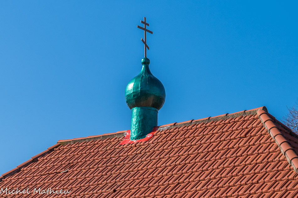 Les clochers à bulbe sont caractéristiques de l'architecture religieuse russe. La neige trop lourde menaçant les coupoles hémisphériques, les russes rehaussent les coupoles par des bulbes évoquant la flamme d'un cierge, dont la couleur verte vient de l'oxydation du cuivre. La coupole évoque la réunification du Ciel et de la Terre. La croix orthodoxe russe, dite aussi croix byzantine, est une variante de la croix chrétienne. Elle en conserve la forme tout en ajoutant une petite barre horizontale au-dessus de la principale, afin de figurer la pancarte accrochée par Ponce Pilate, et une courte traverse supplémentaire en biais près de sa base, représentant l'appui des pieds du Christ. L'orientation de cet appuie-pieds diffère selon les traditions. D'après la coutume orthodoxe russe, la traverse est penchée vers la droite, en direction du bon larron. Dans d'autres Églises, comme l’Église grecque orthodoxe, le repose-pieds reste droit.