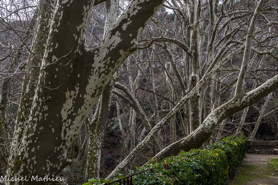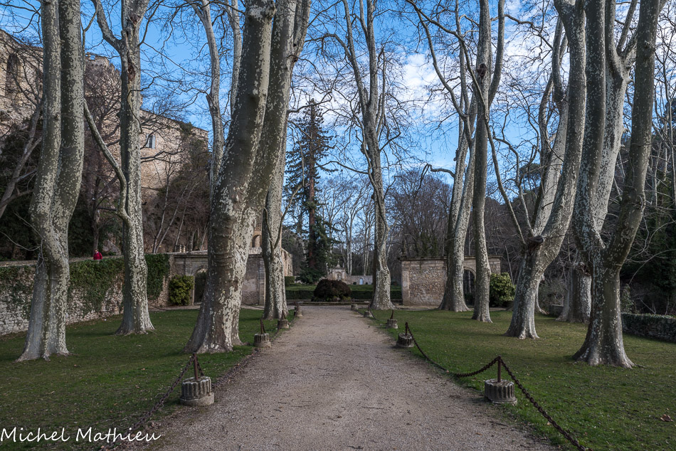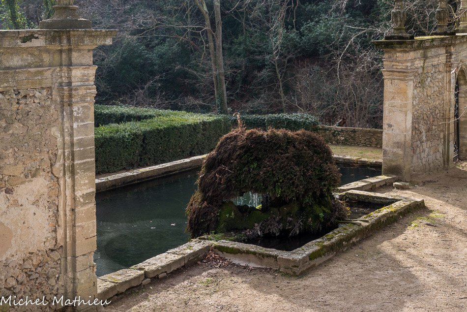 Une allée bordée de platanes, menant aux jardins, classée comme le château et son jardin Monument Historique, permet d’accéder aux deux portails en fer forgé encadrant un bassin rectangulaire qui pourrait être une scène.