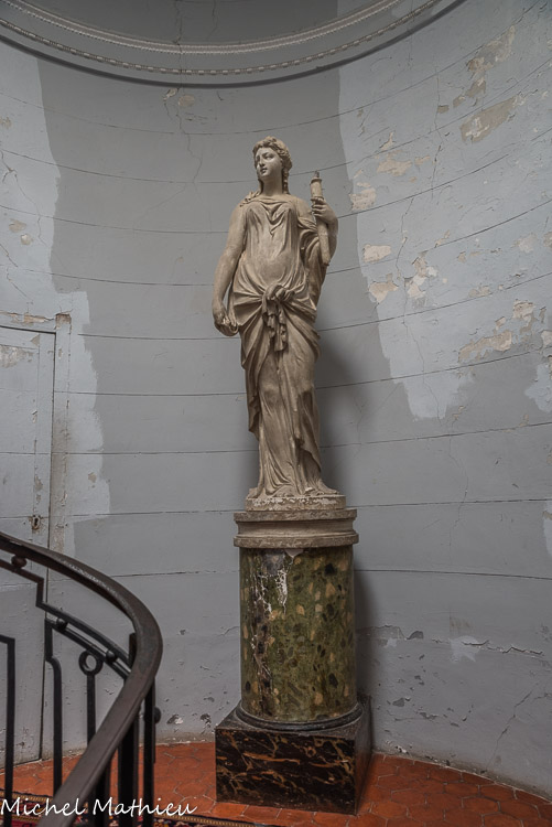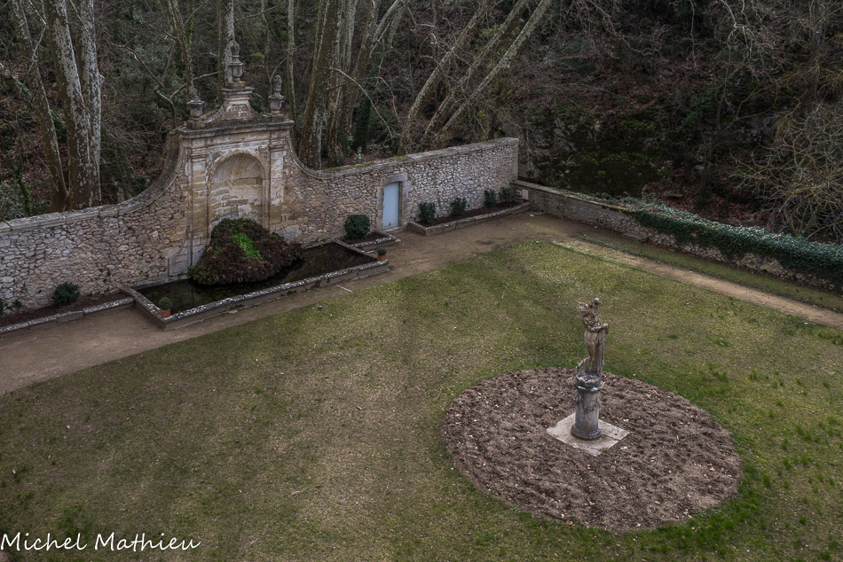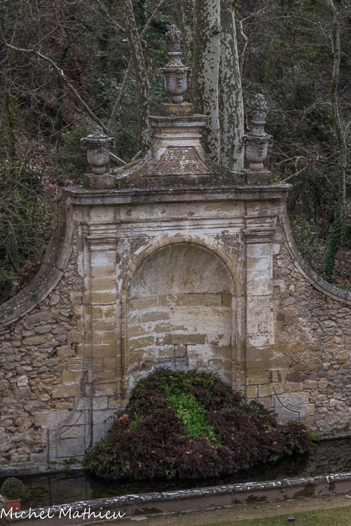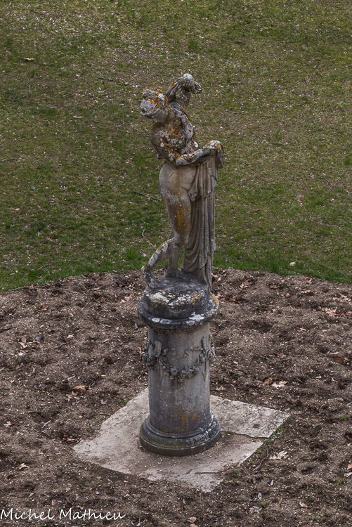 Au centre de la terrasse engazonnée, une statue d’une gracieuse déesse se dresse. Le jardin se termine par une fontaine monumentale, surmontée d’un édicule, flanqué de trois très beaux pots à feu.