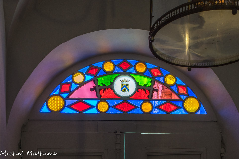 Le blason, avec à droite les armes des Forbin : trois têtes de léopard, un chevron, une couronne de marquis, un heaume de Comte. A gauche celles des Villeneuve. Roselyne de Villeneuve-Trans-Flayosc a été mariée à Palamède de Forbin La Barben, marquis de Forbin La Barben, au XIXème siècle. Elle est de la famille des de Villeneuve, châtelains de Roquefort la Bédoule depuis le XIIème siècle. En bas, la devise des Forbin. En haut, celle de Palamède La Barben : le plus doux plus fort.