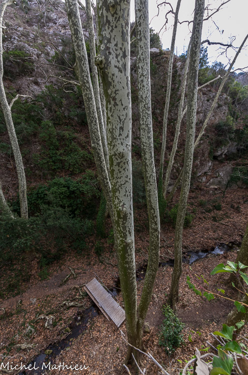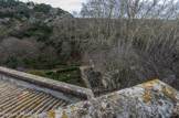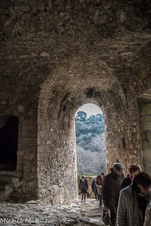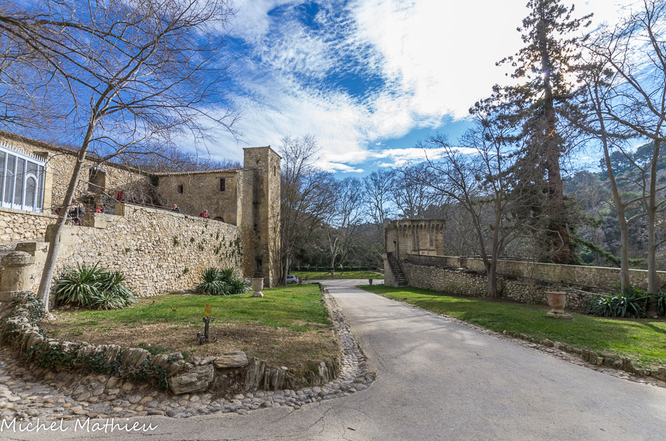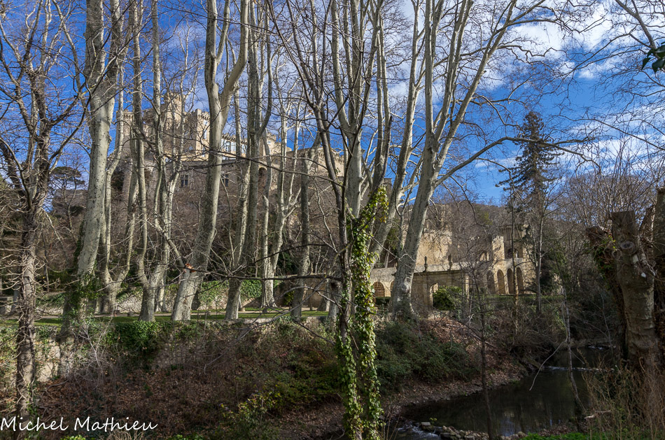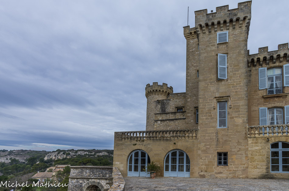 L’emplacement de ce château, situé dans un environnement grandiose surplombant un oasis de verdure dû aux eaux abondantes du Vallon de Maurel et de La Touloubre (ici, à droite), serait selon certains auteurs l’ancienne Pisavis près de laquelle passait la voie Aurélienne. Sous la rampe d’accès au château, se succèdent des orangeries et des serres, fermées par des portes métalliques du XIXème siècle, puis des arcades qui laissent entrevoir des blocs de rocher sur lesquels est construit l’ensemble de l’édifice.