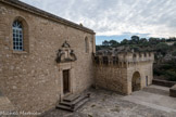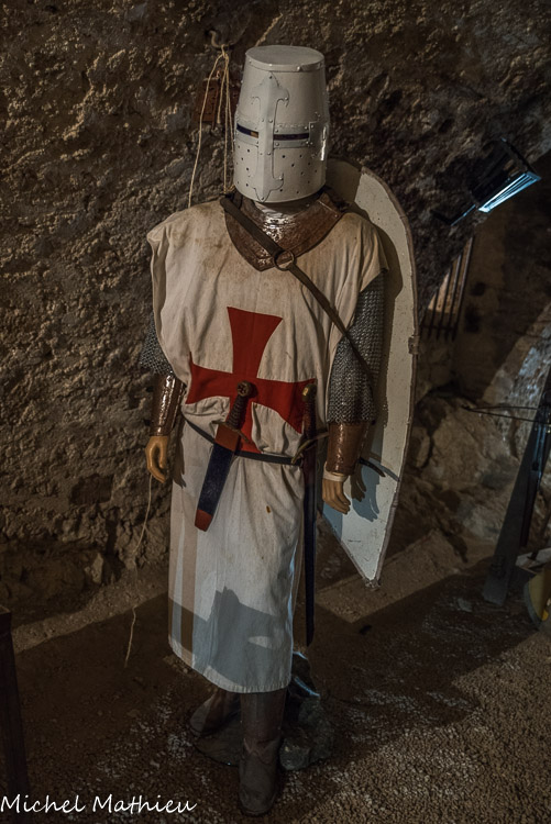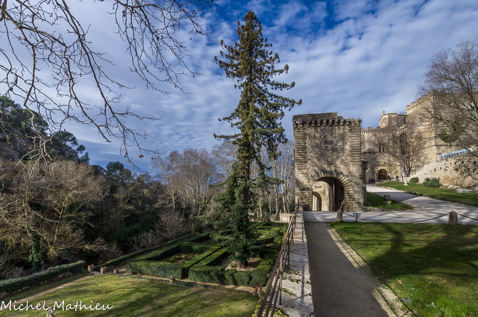 Château fort conçu pour la défense, il fut bâti sur d’énormes rochers qui le rendent imprenable. Ses tours, tourelles et terrasses suspendues, se marient avec la nature pour former une unité qui confère à ce site sa beauté et son mystère. Au premier plan, le puits. A gauche, la tour ronde dite de "Palamède".