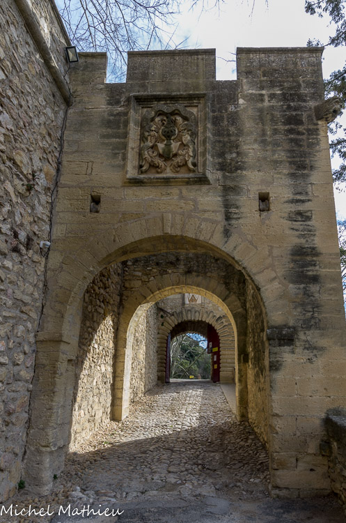 Dans l"écusson, la devise des Forbin “J’ai fait le Roi Comte, le Comte m’a fait Roi”. Au dessus de la poterne, les poulies du pont-levis.
