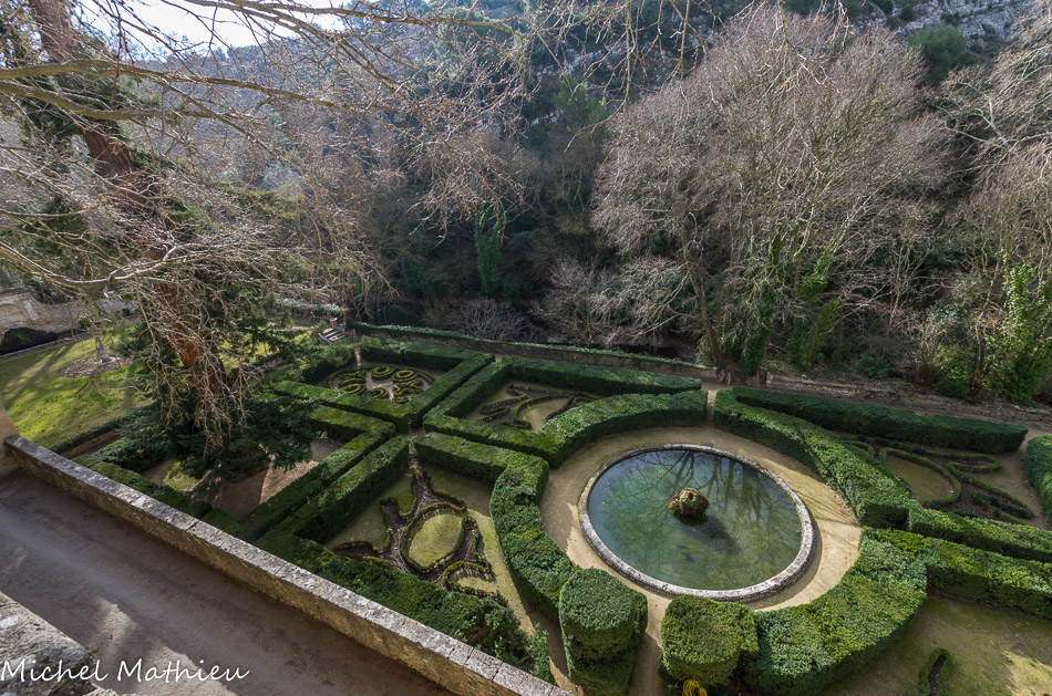 Sept parterres de buis agrémentés de broderies fleuries se répartissent autour d’un bassin circulaire.