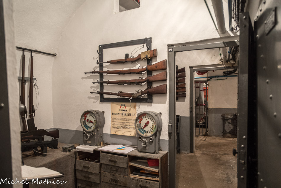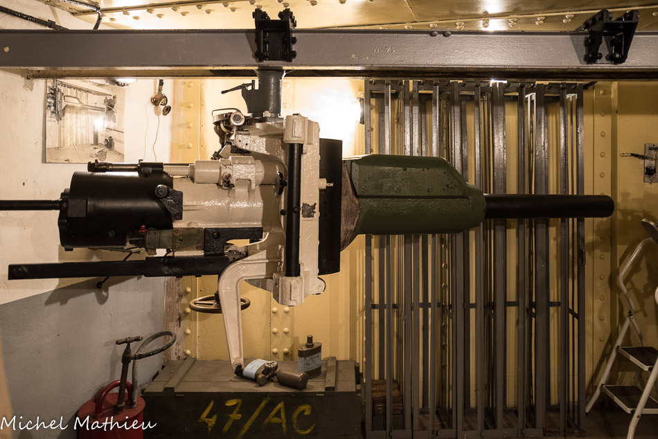 Le petit ouvrage de la Frassinéa. Au sol, mitrailleuse tchèque. Les gaz toxiques produits par les tirs doivent être rapidement dirigés vers l'extérieur. C'est la raison pour laquelle non seulement la casemate est isolée du reste de la fortification par une porte étanche mais, de plus, elle est mise en surpression (+10Pa pour les casemates à JM et AC47). Et comme les armes sont sur des rotules étanches, grâce à cette surpression les gaz toxique qu'elles produisent sont expulsés à l'extérieur de la fortification, par le canon des armes, à chaque ouverture de culasse.