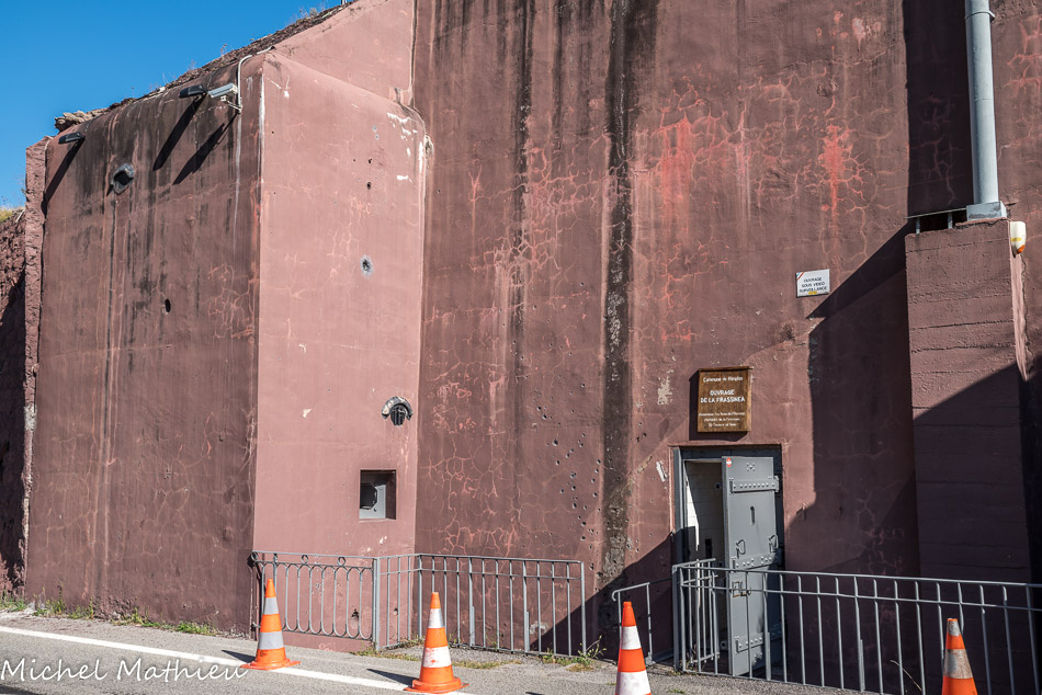 Le petit ouvrage de la Frassinéa. L'imposante façade (à contrepente par rapport à la frontière) n'est qu'un mur de soutènement de la montagne relativement friable à cet endroit. La cheminée de hauteur imposante est le tuyau d'échappement des groupes électrogènes ; la cheminée basse, voisine, évacue l'air vicié.