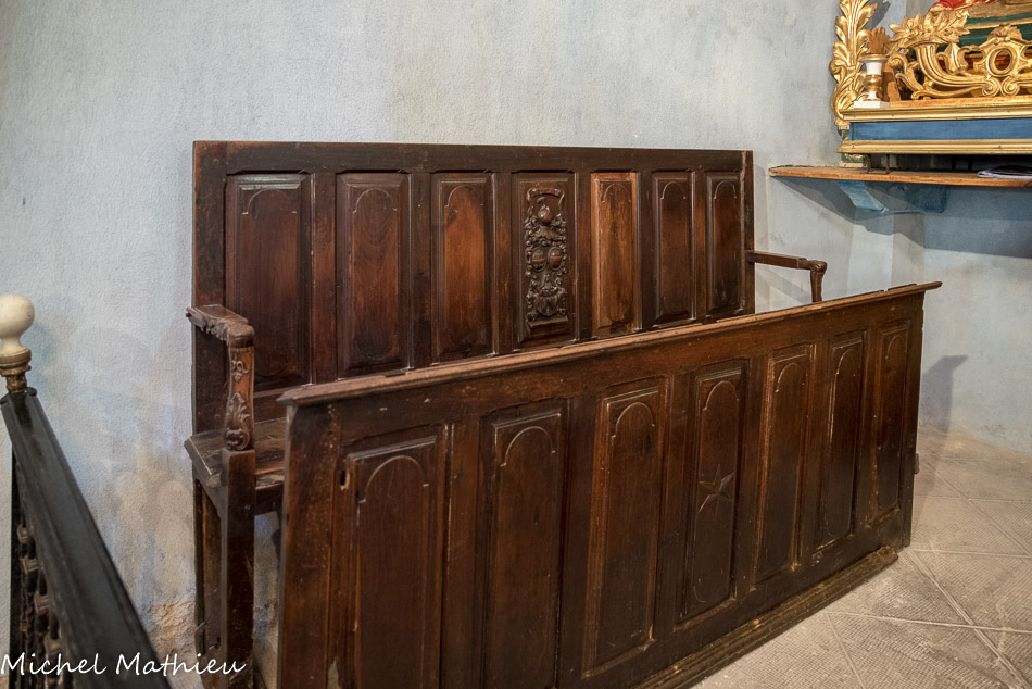 Saint-Sauveur-sur-Tinée Chapelle des pénitents blancs. Banc de cérémonie en noyer datant de la première moitié du XVIIIe siècle et portant, sculpté, le blason de la riche famille notable des Ongran.