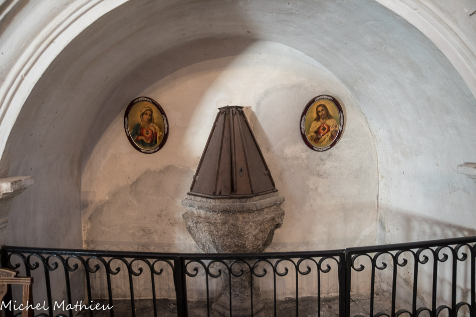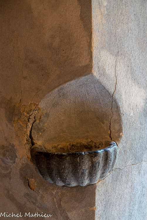 Chapelle Saint Sébastien de Roure. A l'entrée, un étrange bénitier nous accueille.