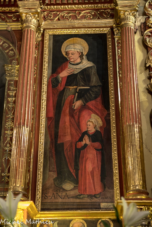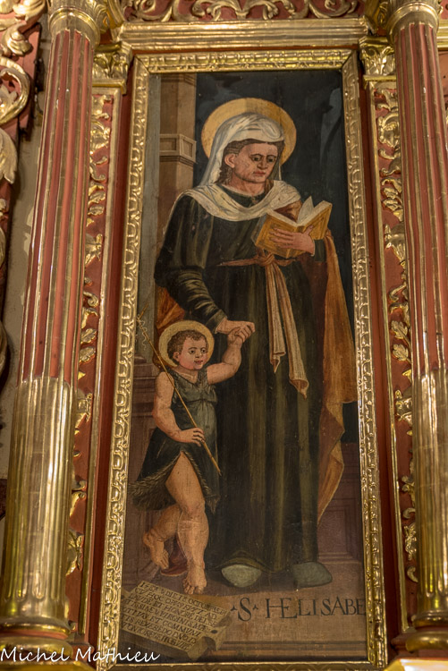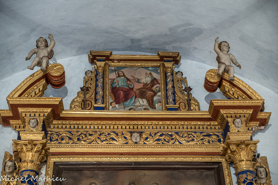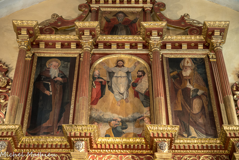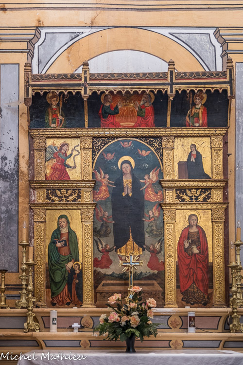Roure. Le panneau central représente la Vierge emportée par des anges, au-dessus d’un tombeau vide et d’un paysage de montagnes. Au-dessus, la Ste Trinité couronnant la Vierge. De part et d’autre, et de bas en haut, dans quatre panneaux sur fond d’or : à gauche, Ste Anne, à droite, Ste Marie- Madeleine. Au-dessus l’évocation de l’Annonciation (à gauche, l’archange Gabriel, à droite Marie). Registre supérieur : deux saints évêques.
