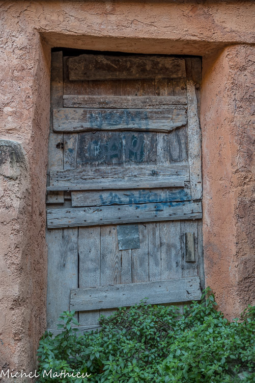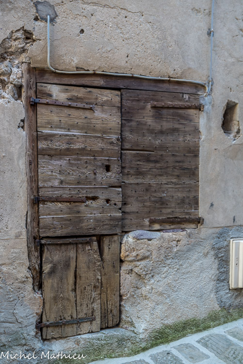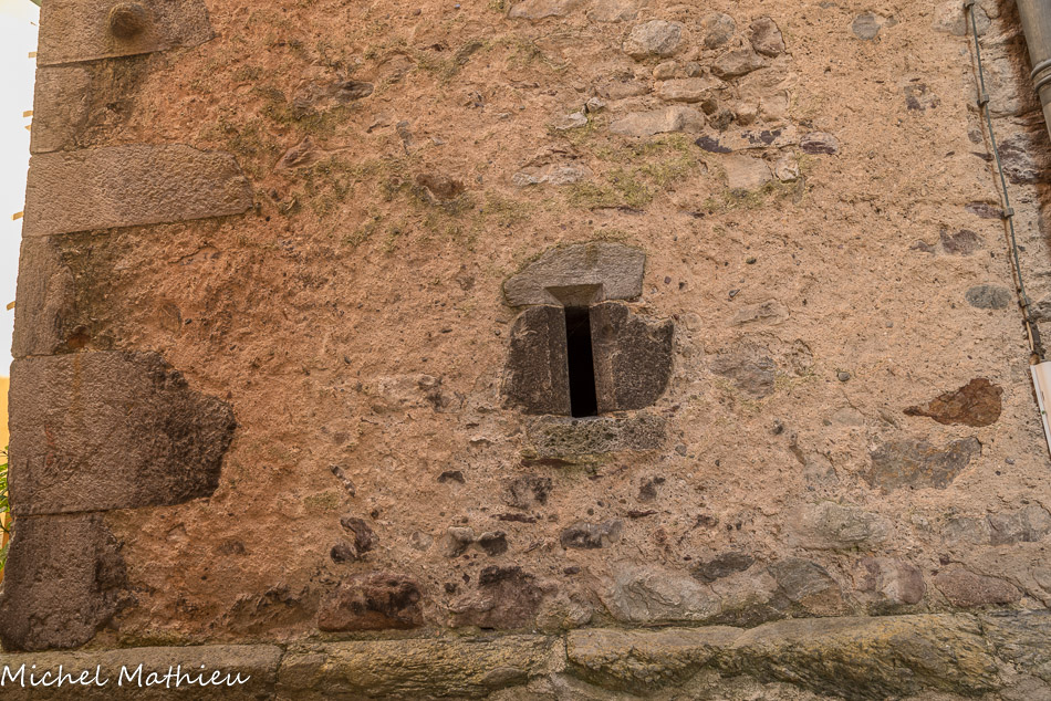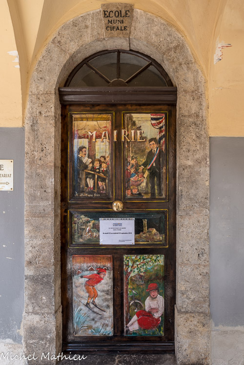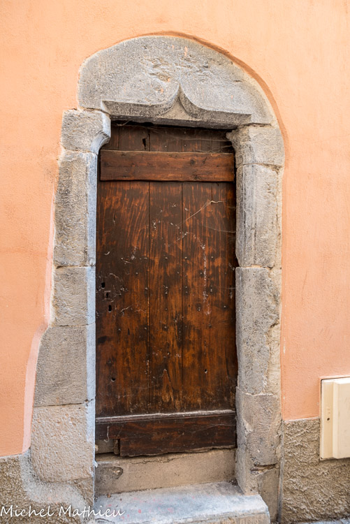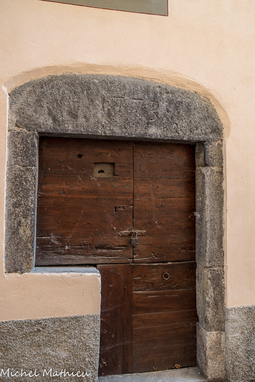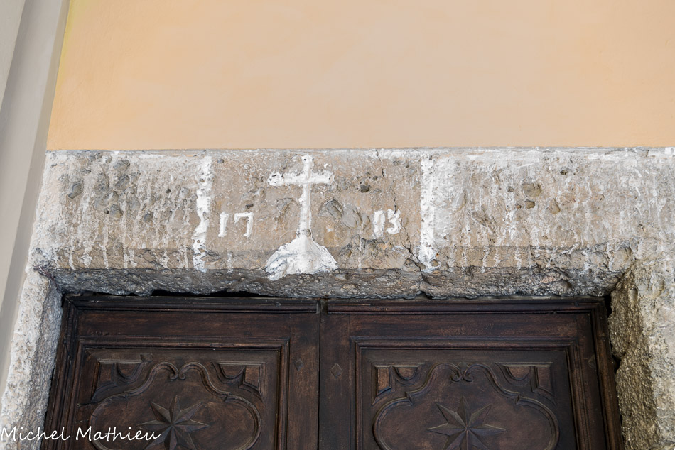 Roure. On accède à la porte, aux panneaux de bois sculptés, par un perron de 9 marches. Dans la partie supérieure, une fenêtre quadrifoliée. Au-dessus, un cadran solaire daté de 1760.