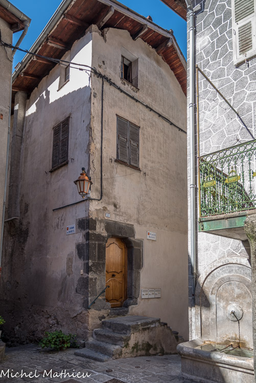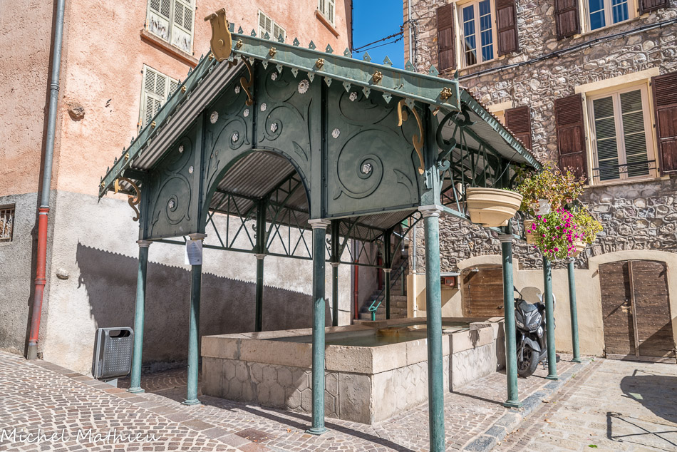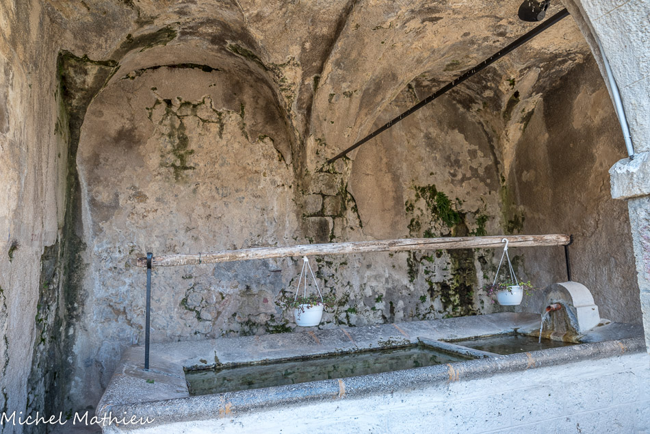 Roure. La fontaine et les lavoirs, sous arcades, surmontés de l'aire de séchage.