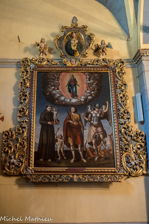 Roure. Dans la partie inférieure, le Purgatoire présenté comme un enfer provisoire. Dans le panneau central, le Christ ressuscité est entouré des instruments de la passion. Il est encadré, à gauche par St Marc l’Evangéliste et à droite, par Ste Brigitte (?), tenant un démon enchaîné. Dans la partie supérieure, au centre, Dieu le Père, est encadré par deux archanges. St Michel, à gauche, représenté en chef des légions célestes, pèse les âmes des défunts. St Raphaël, à droite, accompagne et protège le jeune Tobie, qui porte le poisson destiné à guérir la cécité de son père, Tobias. St Raphaël est le modèle de référence de « l’ange gardien ».