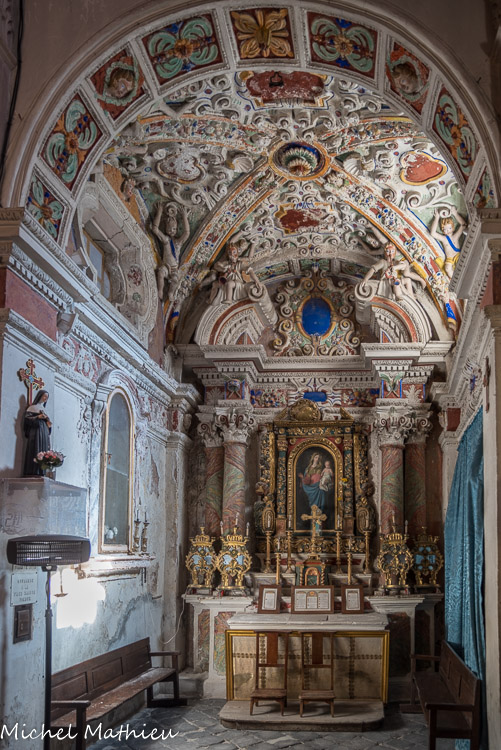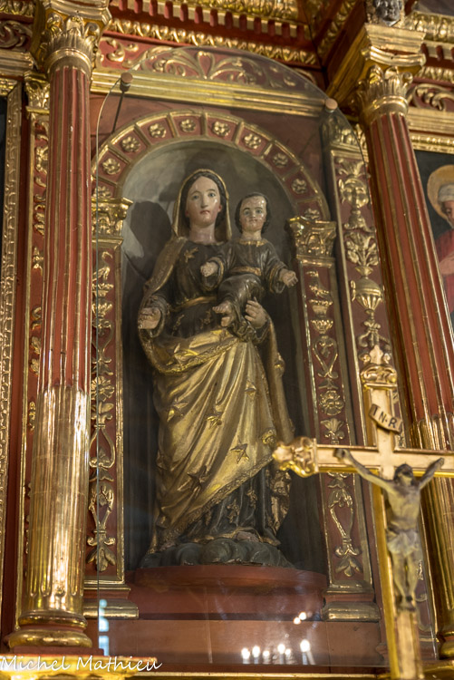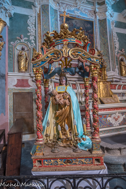 Roure. L’autel de la Vierge.Deux colonnes de marbre encadrent une Vierge à l’Enfant, entièrement dorée, surmontée d’un fronton brisé. Beau tabernacle.