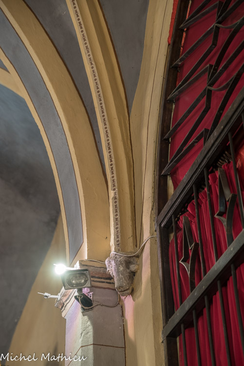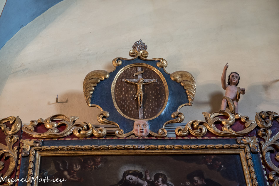 Entre deux colonnes de marbre, se dresse un grand Christ crucifié, vraisemblablement du XVIe siècle, surmonté d’un fronton brisé orné d’angelots qui brandissent les instruments de la crucifixion.