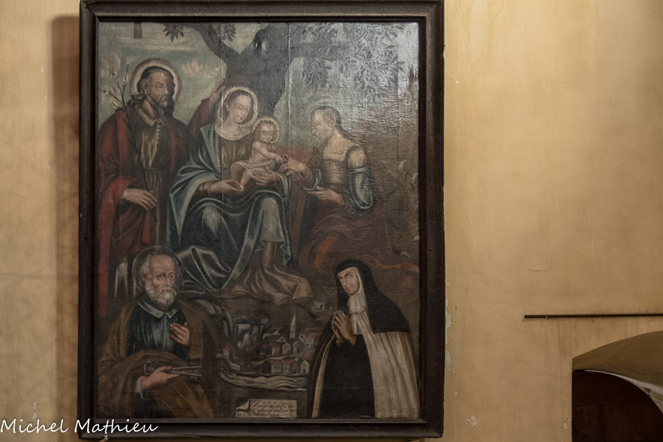 Chapelle des pénitents blancs. La toile principale est divisée en deux niveaux superposés. En partie basse, à gauche, saint Louis de France arbore les insignes de la monarchie (couronne, sceptre et manteau fleurdelisé) ainsi que, parfaitement anachronique, le grand collier de l'Ordre de Saint-Michel fondé deux siècles après sa mort. Raphaël archange accompagne le jeune Tobie qu'il protège du mal symbolisé par le dragon à ses pieds. Saint Barthélemy, à droite, présente le coutelas avec lequel il fut supplicié par écorchement ainsi que le livre de saint Matthieu qui lui aurait servi à évangéliser les Indes. Au registre supérieur, posés sur une nuée, Jean-Baptiste et Jacques le Majeur en pèlerin encadrent la sainte Parentèle associant Marie et sa mère Anne dans l'éducation de Jésus enfant.
