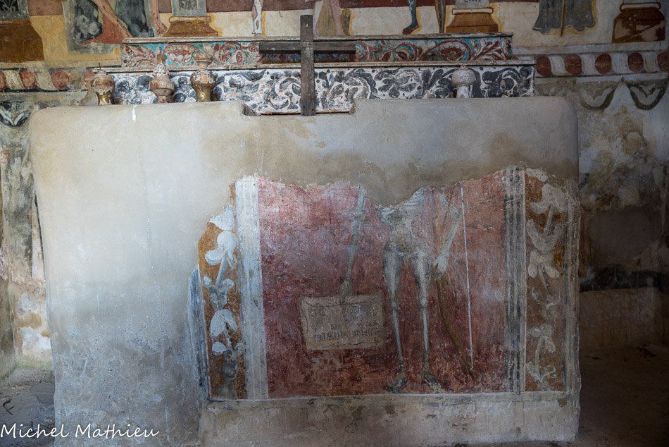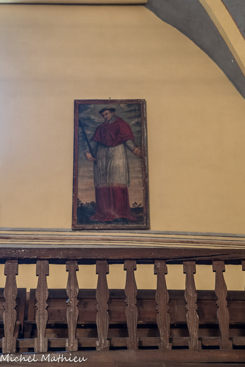 Roure. St Laurent est encadré, à gauche, par St Grat, évêque d’Aoste au Ve siècle, portant la tête de St Jean- Baptiste, qu’il aurait retrouvée dans un puits en Palestine, selon une légende tardive du XIIIe siècle. Il est vénéré comme guérisseur et comme protecteur des récoltes contre les tempêtes et la grêle. A droite, Ste Pétronille. Romaine, considérée comme la fille spirituelle de St Pierre, elle préféra mourir plutôt que d’épouser un noble romain. Elle devient, à partir de Charlemagne, la patronne des rois de France puis la première sainte patronne du royaume. Au-dessus, à gauche, Ste Lucie, jeune fille noble de Syracuse, martyre au IVe siècle. En référence à un épisode de son supplice, elle est représentée portant ses yeux sur un plateau. A côté d’elle, St Antoine l’Ermite, chrétien égyptien, IIIe - IVe siècle, retiré au désert pendant plus de 70 ans. Représenté avec une clochette, comme le veut une tradition sans fondement avec ce que nous connaissons de sa vie. A droite, St Martin, évêque de Tours au IVe siècle. A son côté, Ste Apolline d’Alexandrie, représentée avec des tenailles, instruments de son supplice. Parce qu’elle refusait de blasphémer, on lui arracha les dents. Elle se précipita ensuite, elle-même, dans le bûcher, préparé à son intention par ses bourreaux. Au sommet, Déploration du Christ. Autour du corps, à l’aspect cadavérique saisissant : St Jean l’Evangéliste, Marie et Ste Marie-Madeleine.
