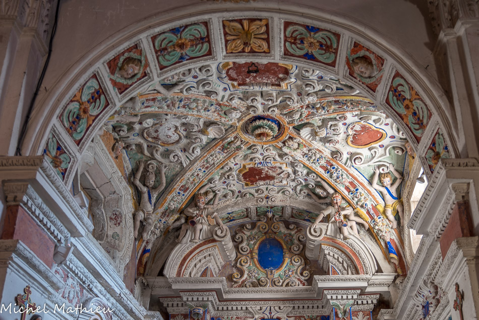 Saint-Sauveur-sur-Tinée Chapelle des pénitents blancs. Colonne habillée de rameaux fleuris et de pampres de vigne, flanquée d'ailerons habités d’angelots.