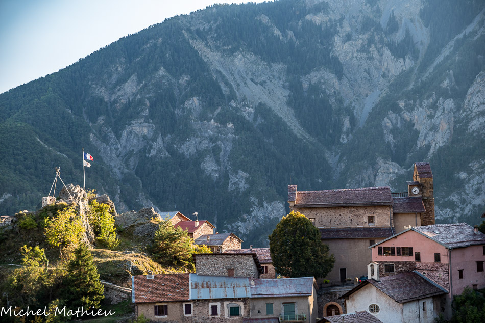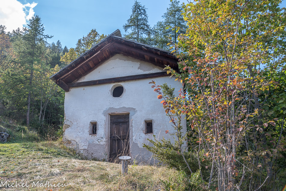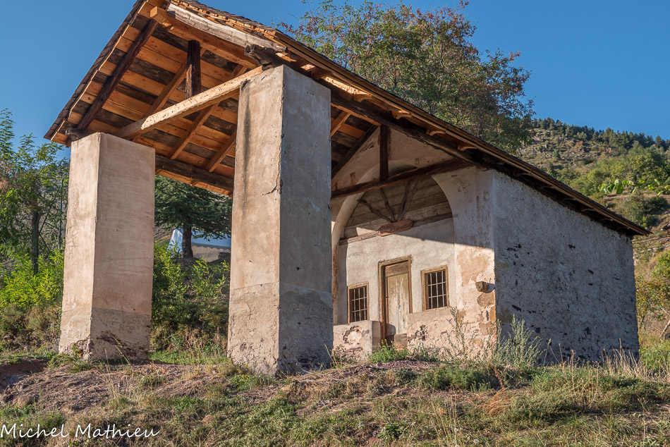 Chapelle Saint Sébastien de Roure. Construite en 1510 pour conjurer le danger de la peste, elle possède un bel auvent.