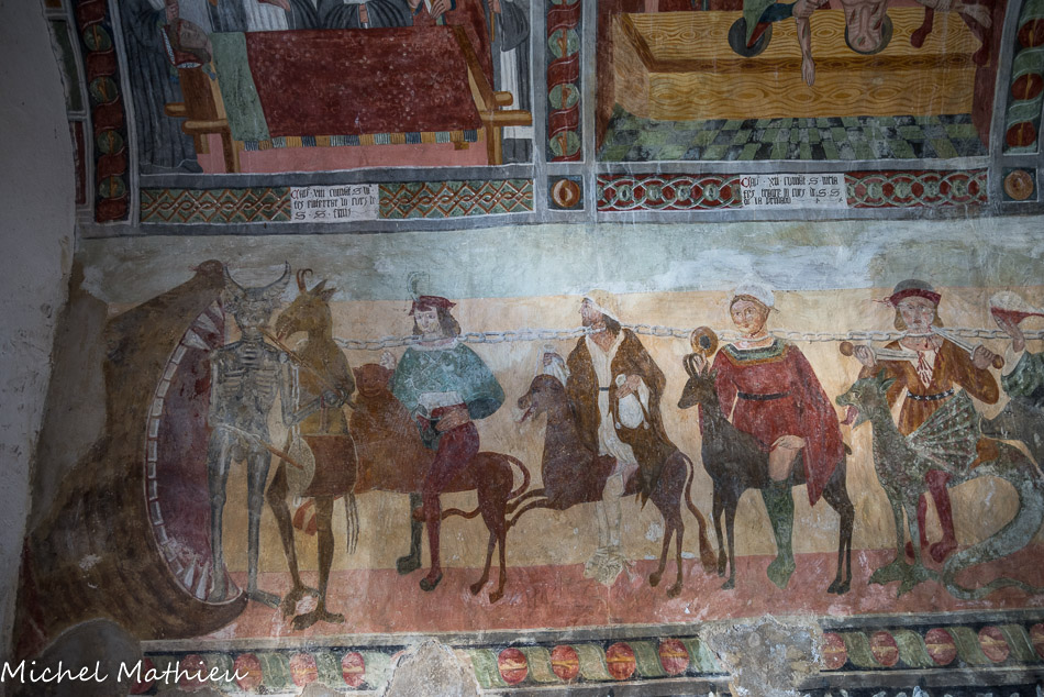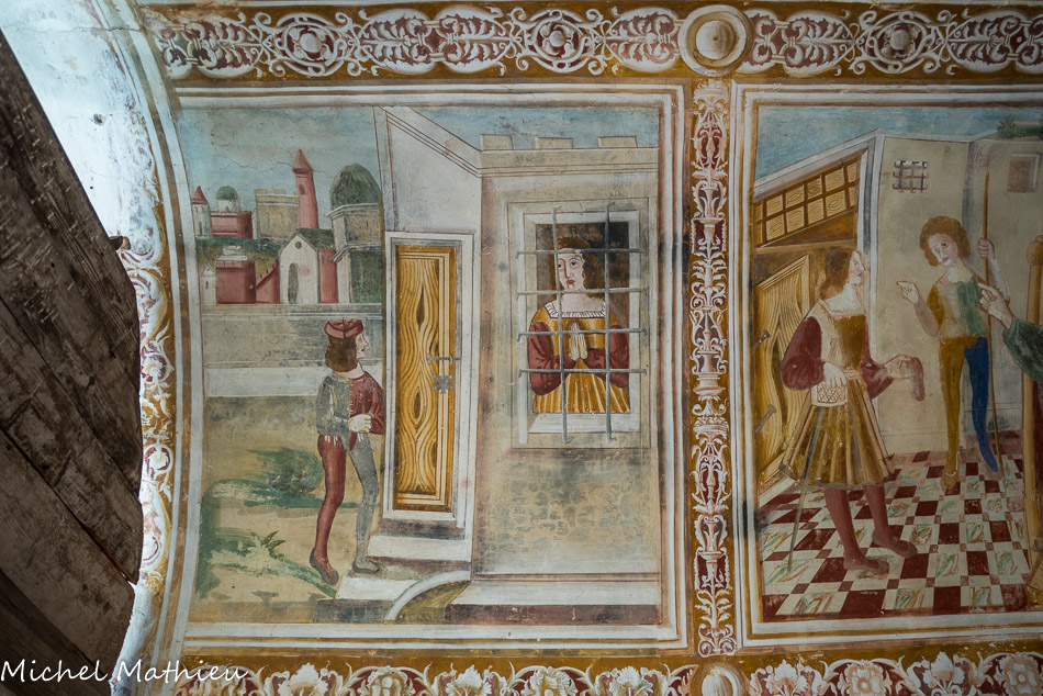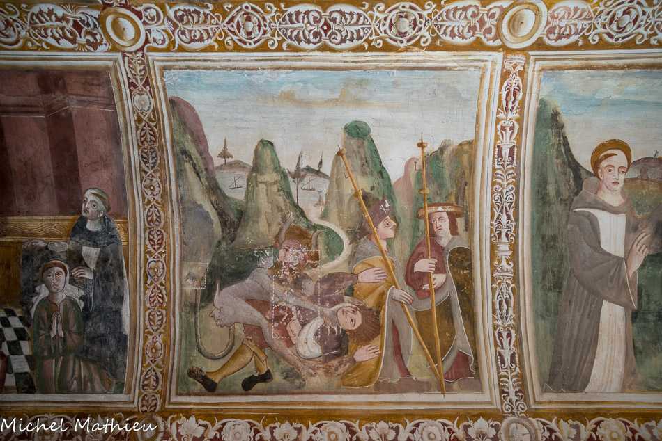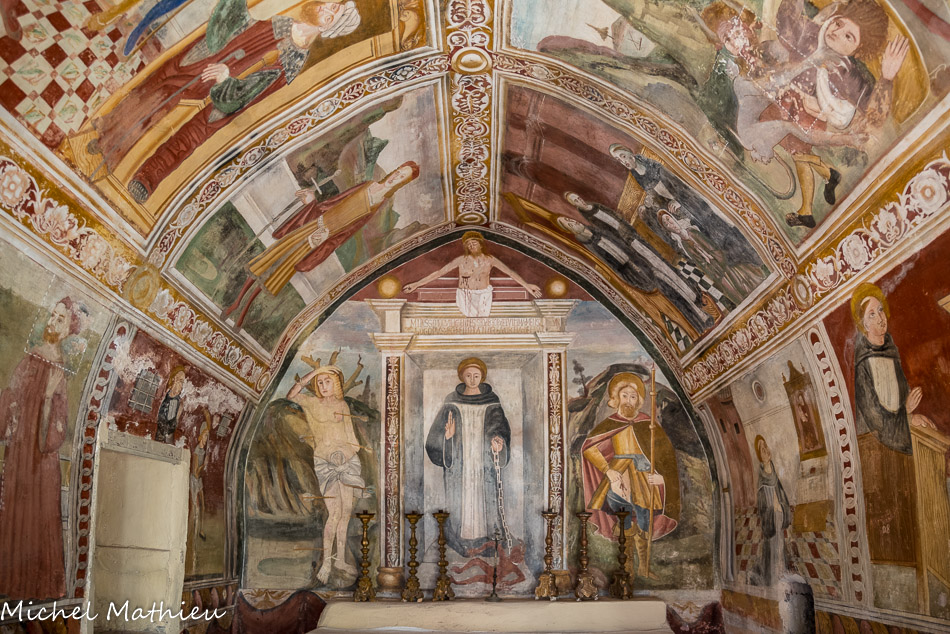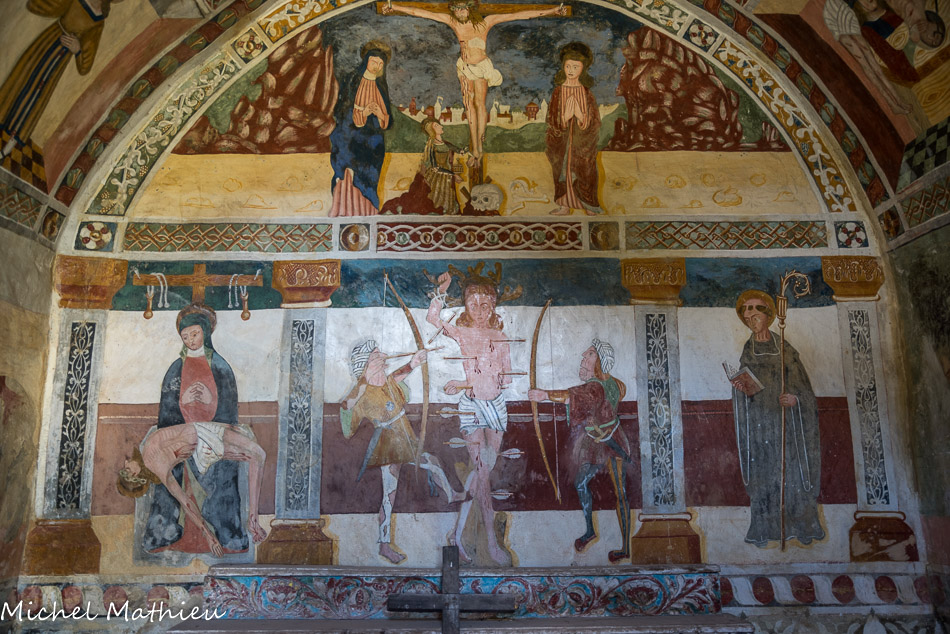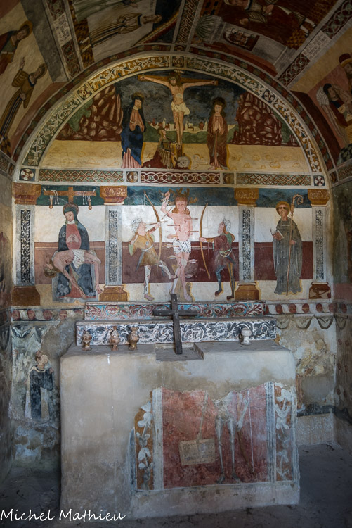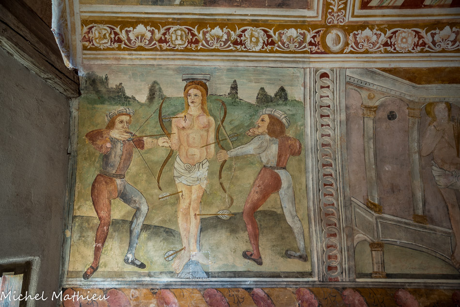 Chapelle Saint Sébastien de Roure. Les fresques murales, du peintre Andréa de Cella, comprennent six panneaux consacrés à la vie de Saint Bernard de Menthon à droite, et six autres, en vis-à-vis, racontant des épisodes de la vie de Saint Sébastien à gauche.