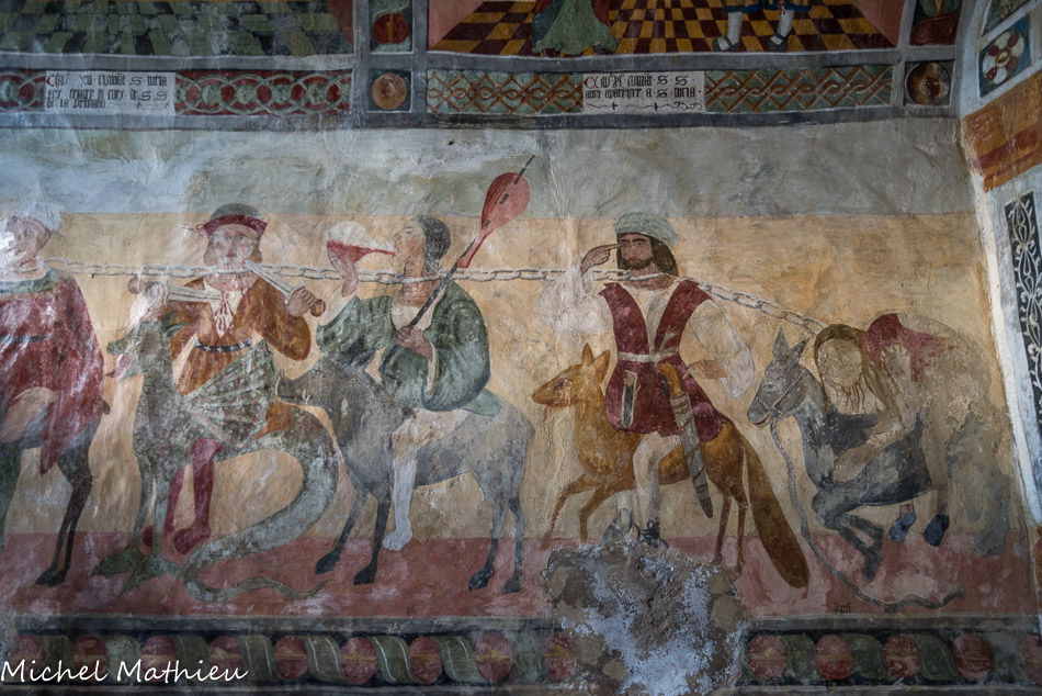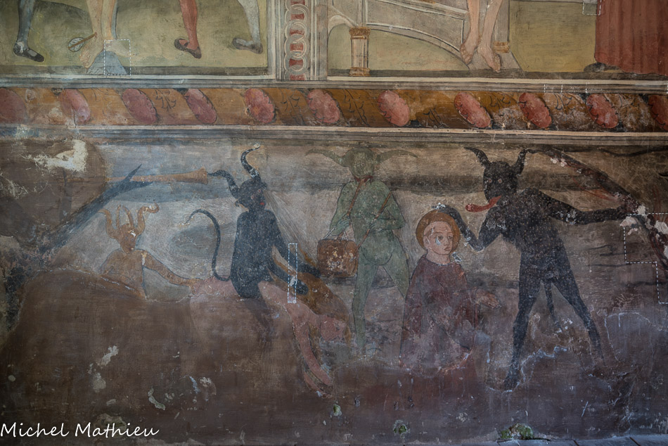Chapelle Saint Sébastien de Roure. Un groupe de pélerins est attaqué par un démon. Quand le christianismre se développe, les anciennes divinités sont réduites au rang de figures démoniaques. Bernard de Menthon, au Xe siècle, va les combattre et les exorciser.