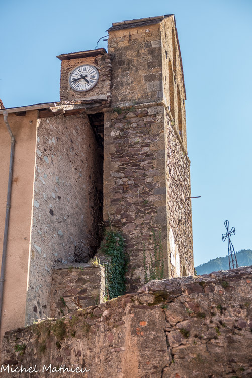 Roure. L’église romane. Au nord de la façade (sur la gauche quand on se trouve face au clocher), il subsiste un mur qui représente vraisemblablement l’angle nord-ouest de la nef médiévale.