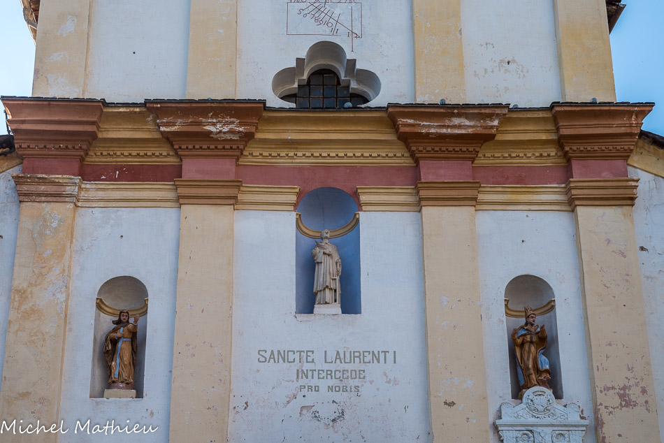 Roure. Au-dessus de la porte, une inscription « Sancte Laurenti intercède pro nobis » (« Saint Laurent intercédez pour nous »), surmontée de la statue du saint, portant la palme du martyre et accompagné de l’instrument de son supplice, un gril. Deux niches latérales abritent les statues d’un saint évêque et d’une sainte, parfois identifiée comme Sainte-Claire (?).